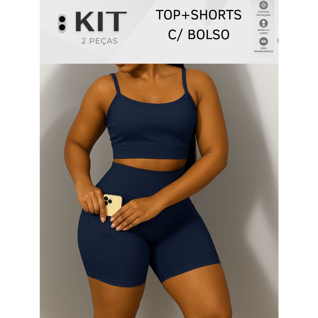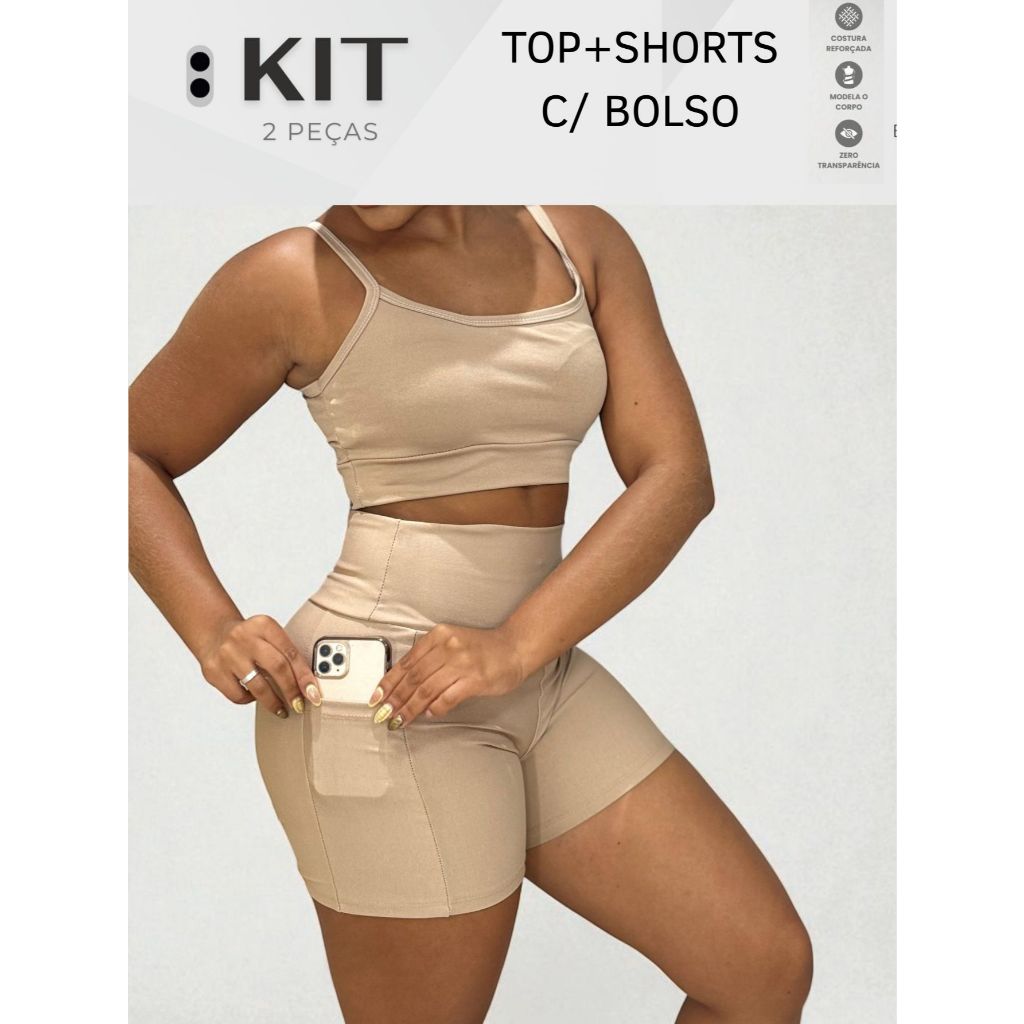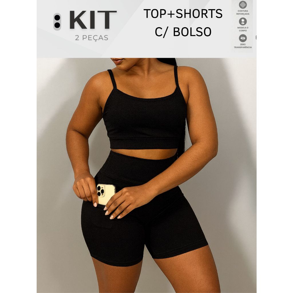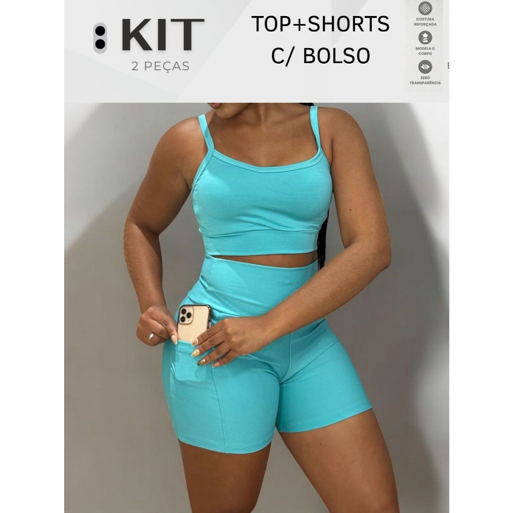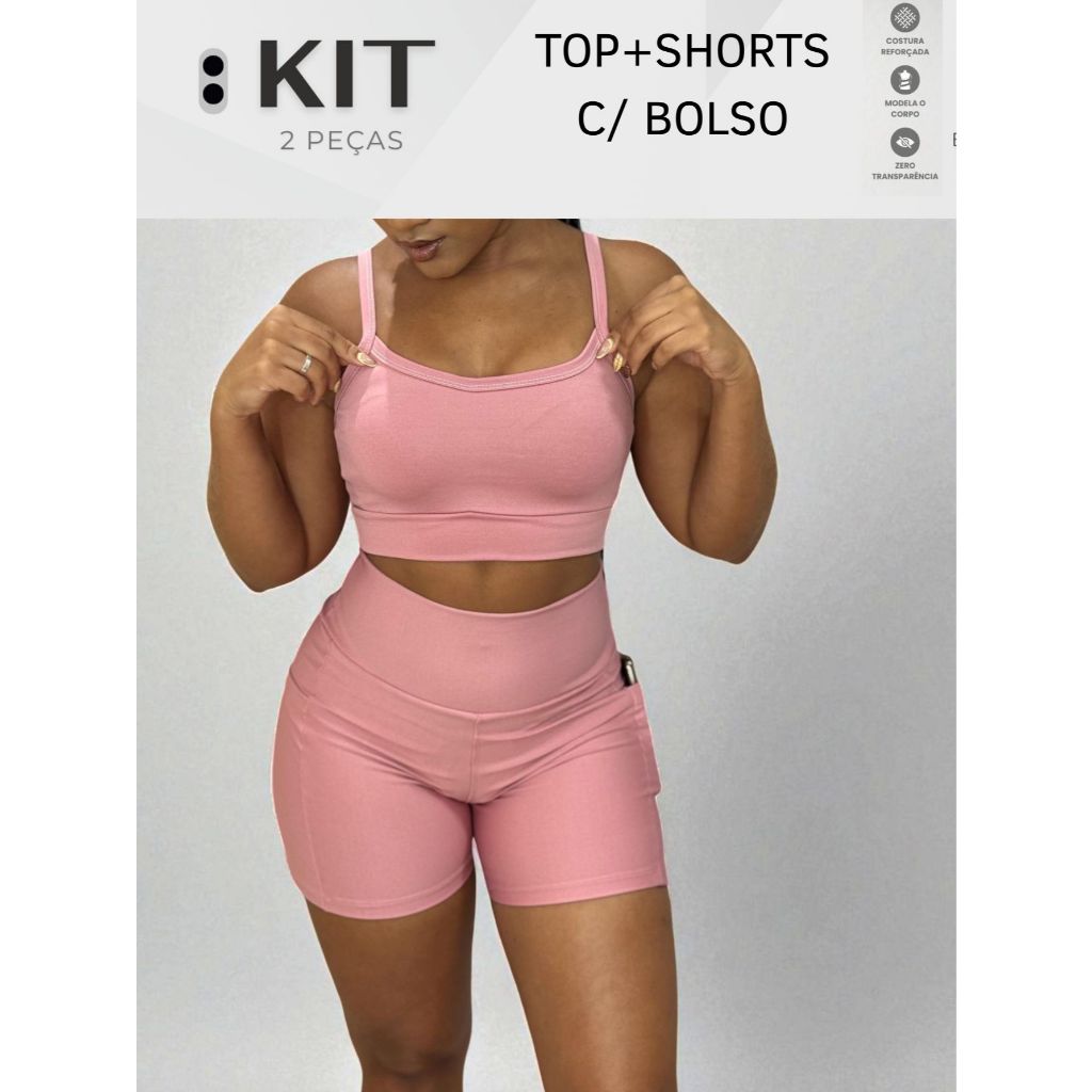 Conjunto top e shorts com BOLSO Fitness Academia Cintura alta Cós Duplo