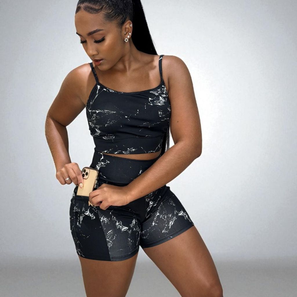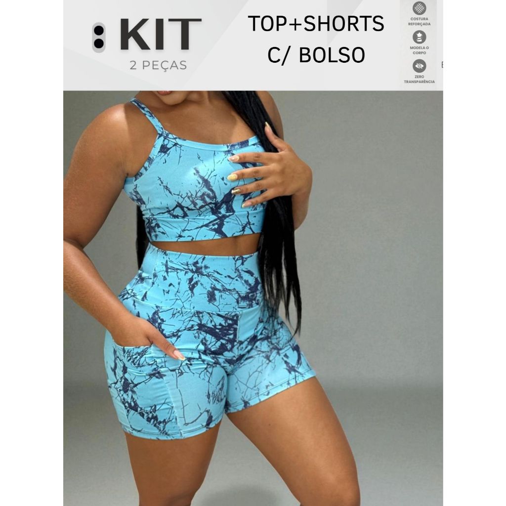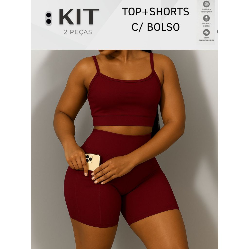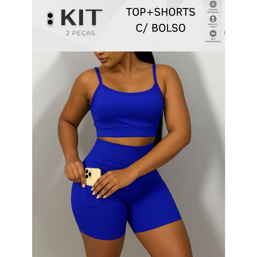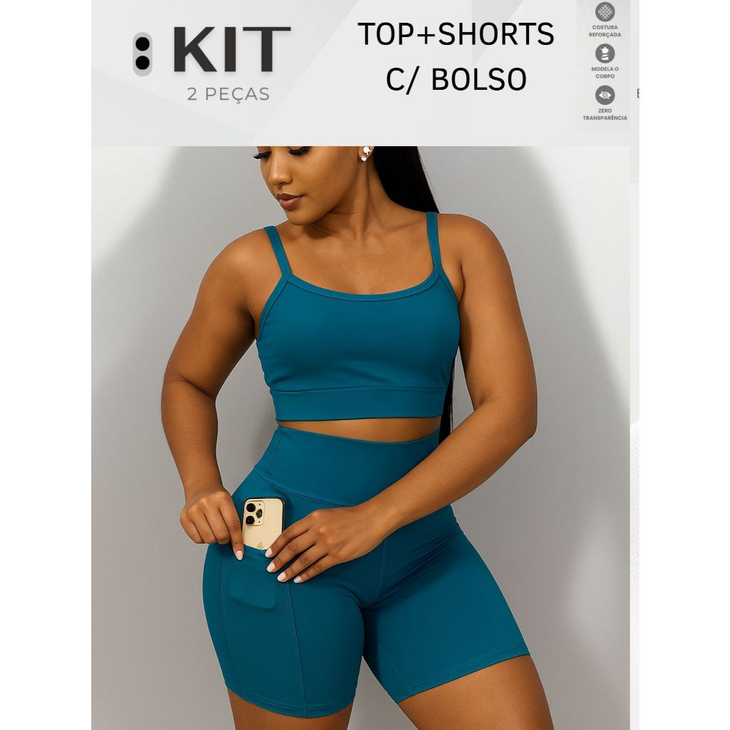 Conjunto top e shorts com BOLSO Fitness Academia Cintura alta Cós Duplo
