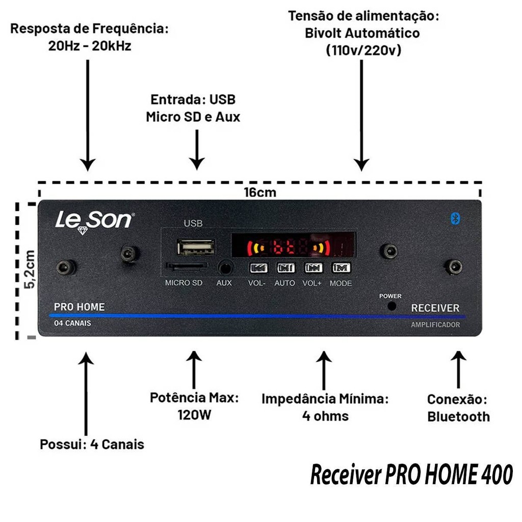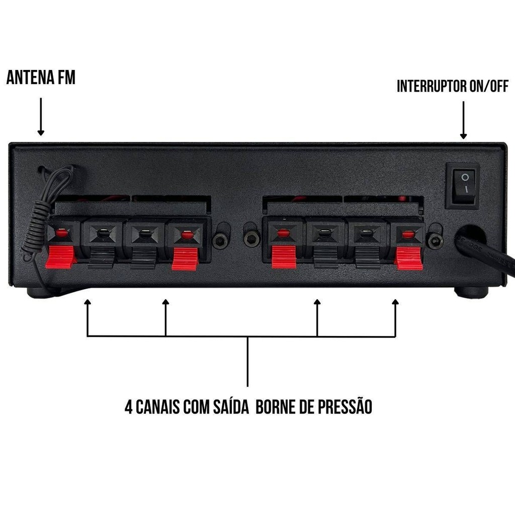 Amplificador Receiver Pro Home Bluetooth 120w USB AUX 4ch