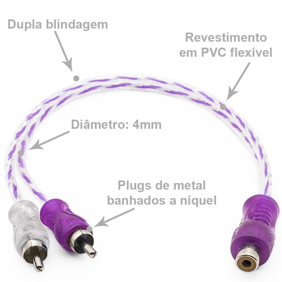 Cabo Y RCA Blindado 1 Femea 2 Machos Injetado Roxo 4mm