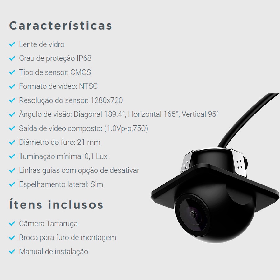 Câmera de Ré ou Frontal Tartaruga Universal 180 Graus 1280x720px Lente de Vídro Linhas guias Proteção IP68 Faaftech FT-CAM-TL