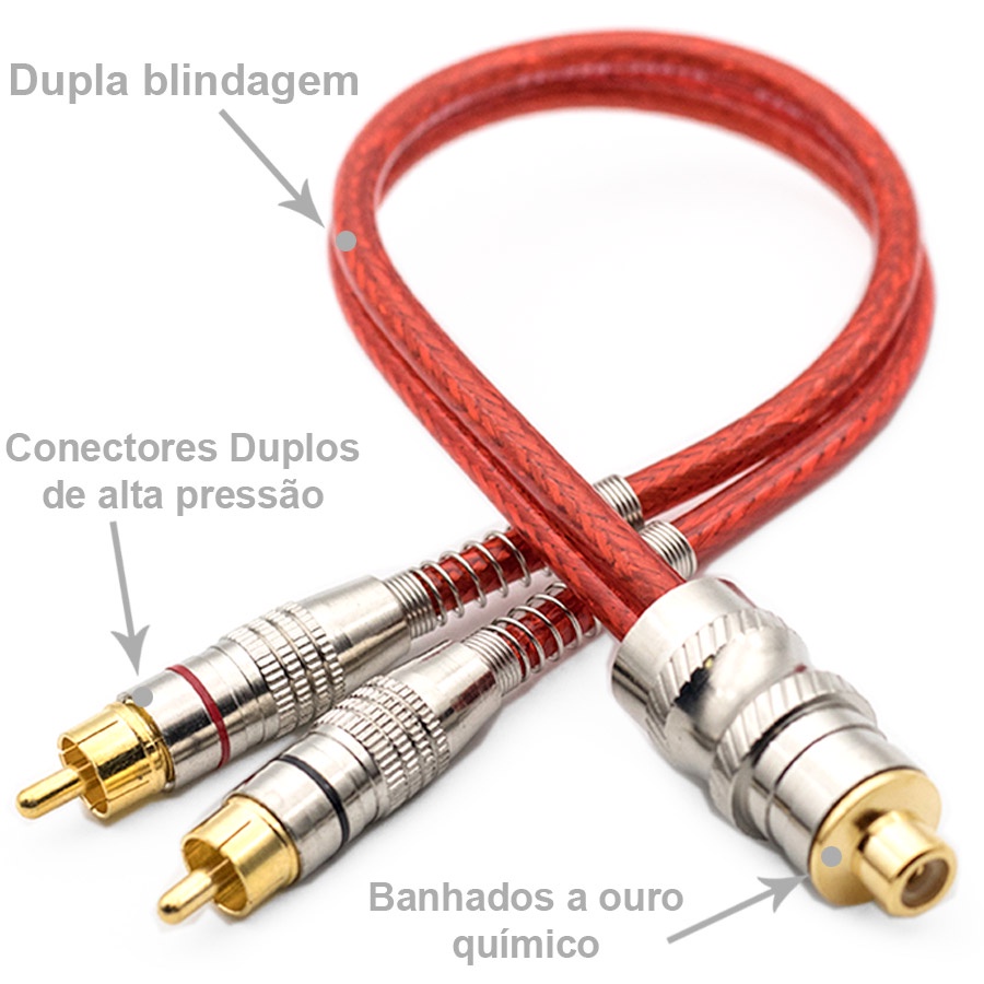 2 Cabos Y RCA Blindado Techone 2 Machos 1 Femea Vermelho Blindados 5mm Plug Metal Som Automotivo Conectores Duplos Banhado a Ouro Proteção Contra Ruídos Fio De Cobre Caixa Bob Paredão
