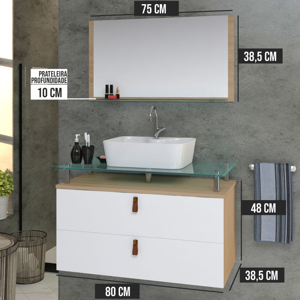 Conjunto Gabinete Banheiro Toquio 80cm MDF + Espelheira + Cuba + tampo de vidro temperado