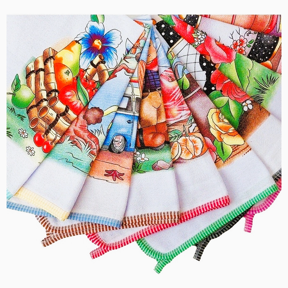 Panos de Prato Viés Overloque 40x65cm Estampado para Cozinha Limpeza em Geral Kit 5-10-15-20 Sortidos
