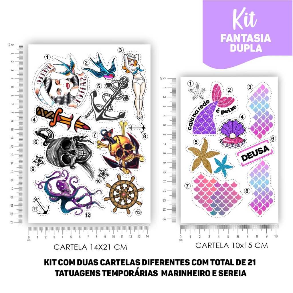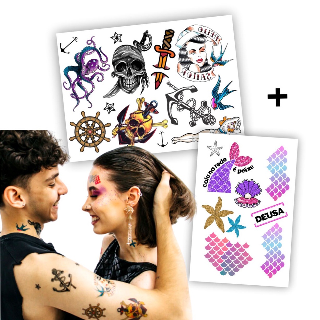 21 Tatuagem Temporária Marinheiro e Sereia Fantasia Cosplay