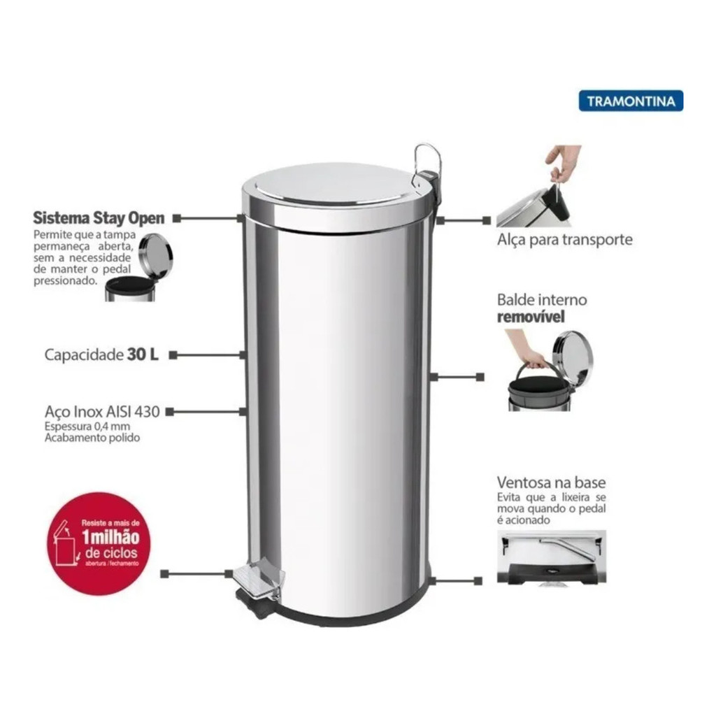 Lixeira Reforçada Inox 30L 20L 12L 5L e 3 Litros Tramontina Com Pedal Brasil Resistencia e Qualidade
