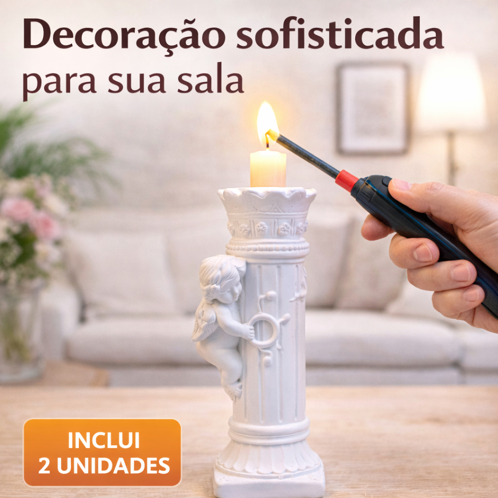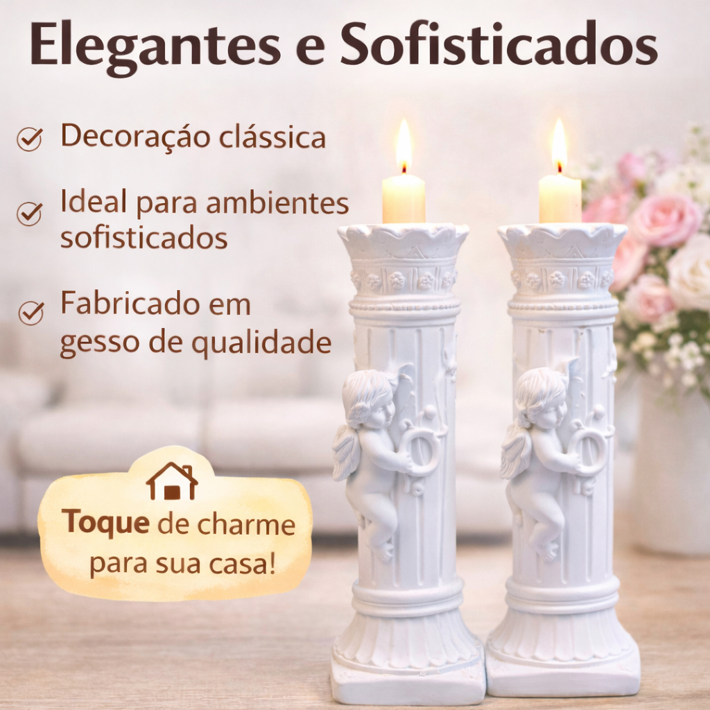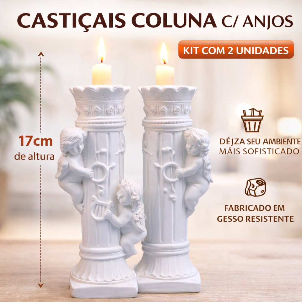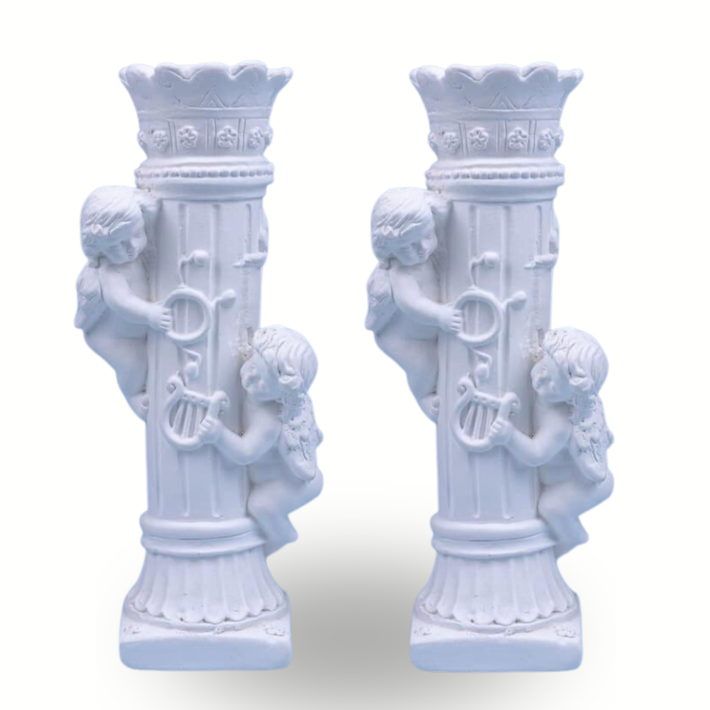 Castiçal Decorativo Anjo Coluna 17cm Em Gesso Kit 2 Peças