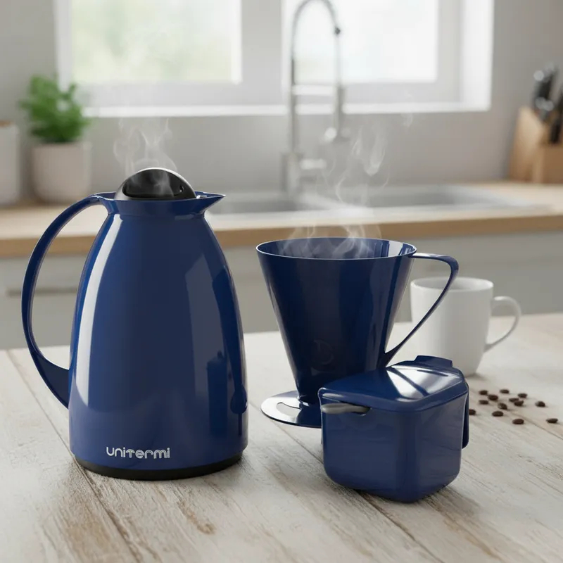 Kit Café Super Pratico Com Garrafa Térmica + Açucareiro Com Colher + Suporte para Filtro UNITERMI Varias Cores