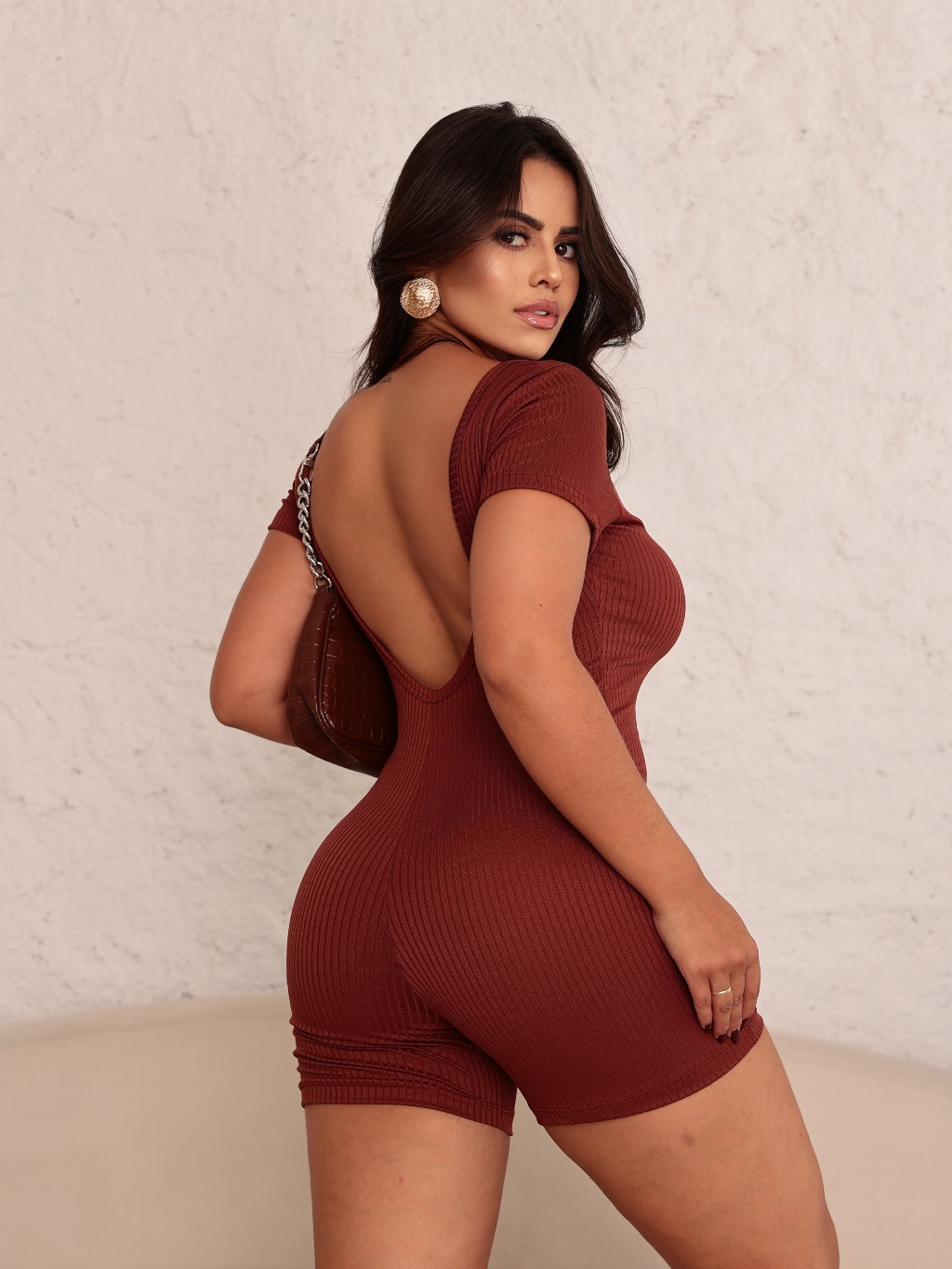 Macaquinho Macacão Canelado Manguinha Costas Abertas Feminino Roupa Casual Academia Fitness Treino