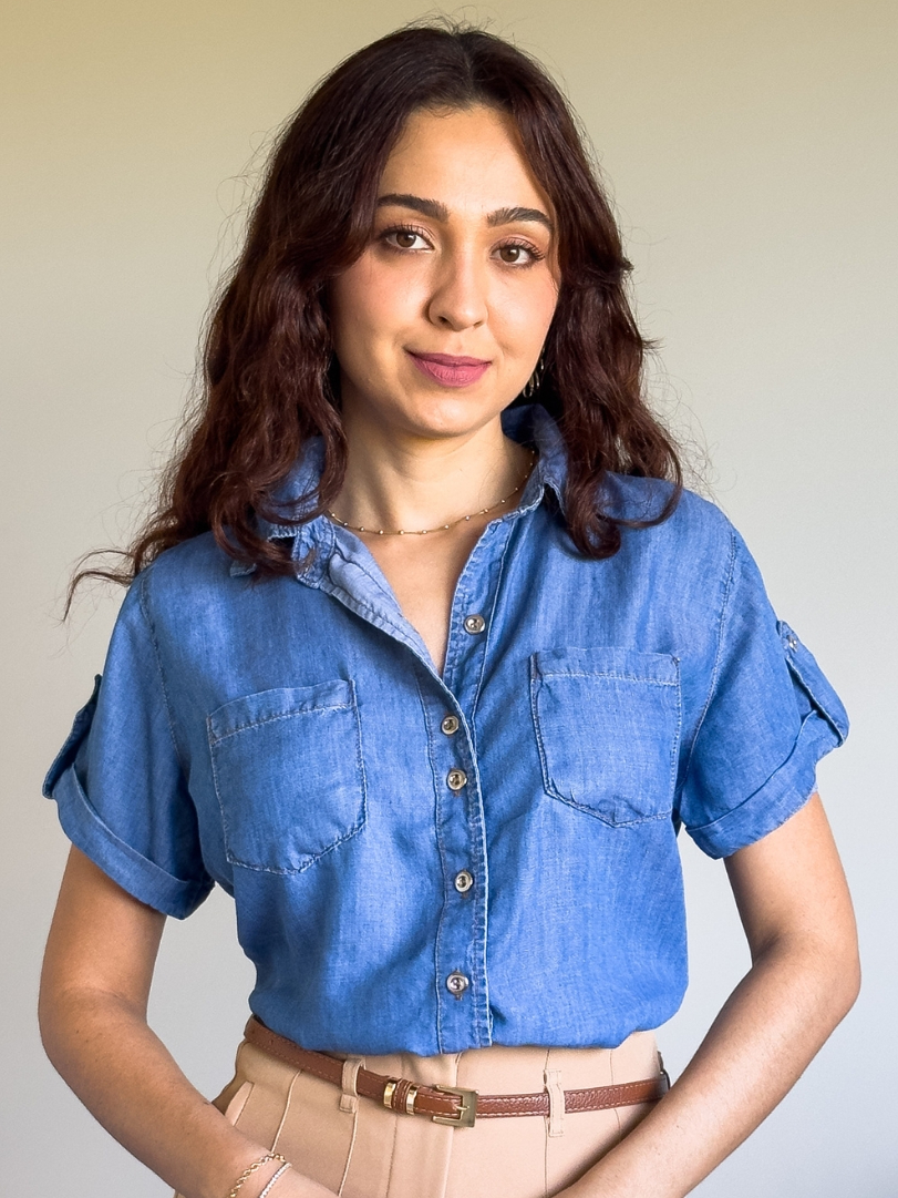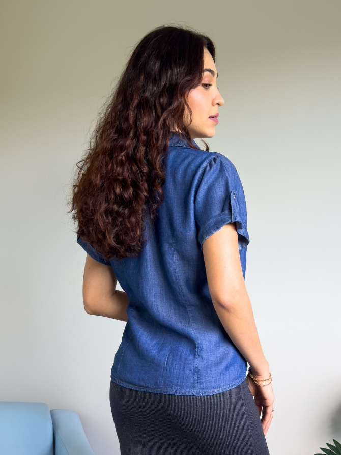 Camisa camisete jeans feminina manga curta e dobrada com bolsos e botões