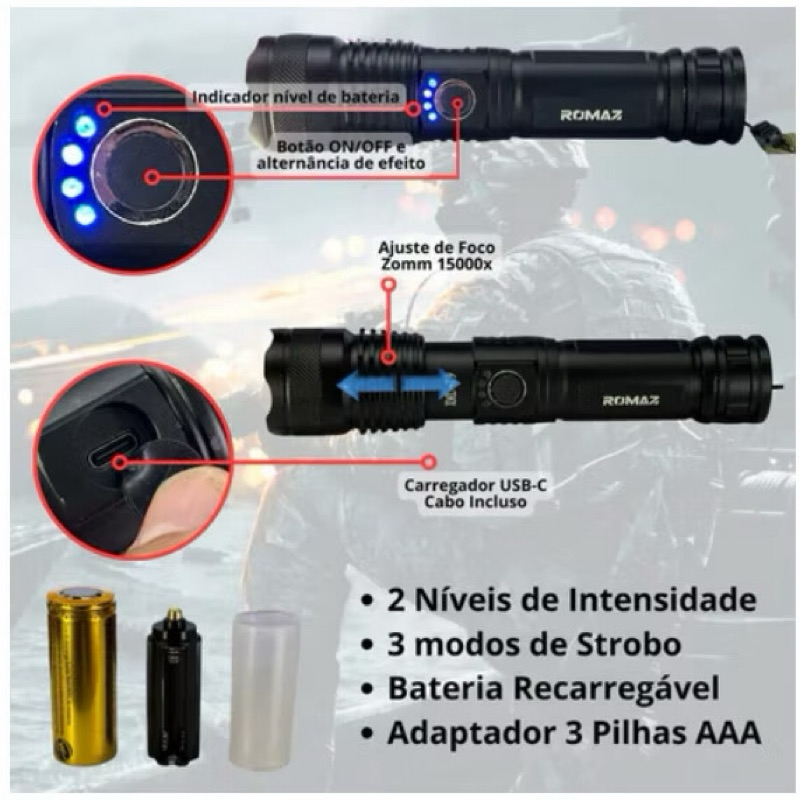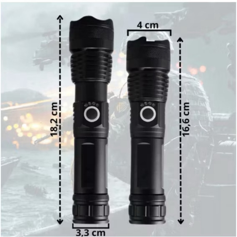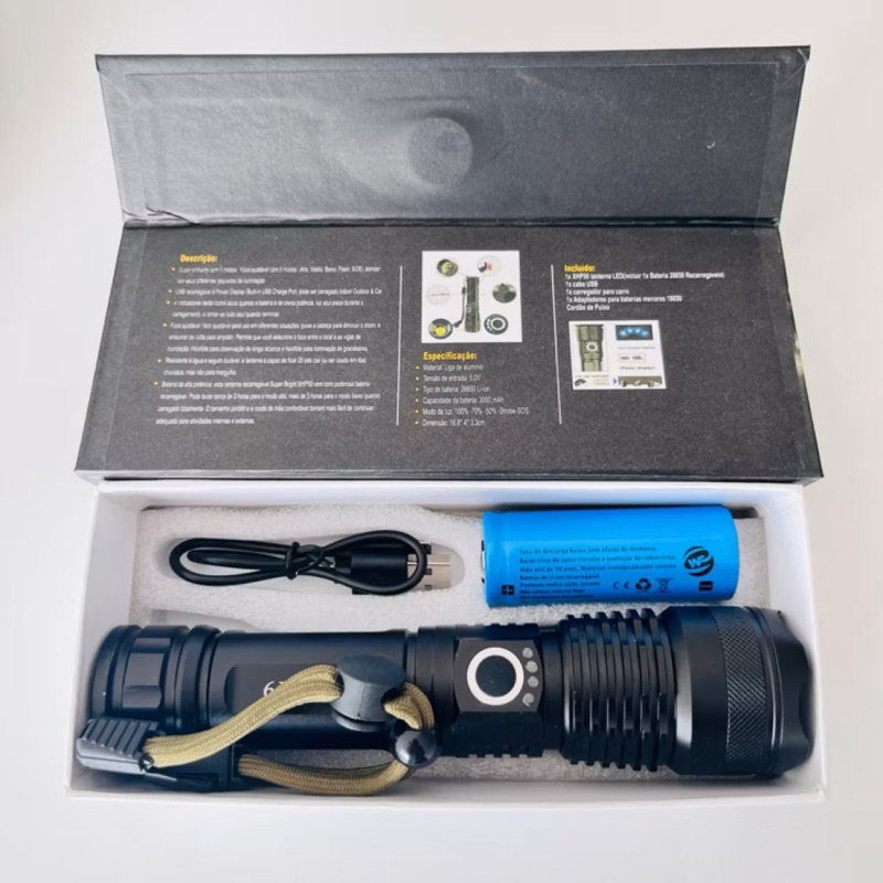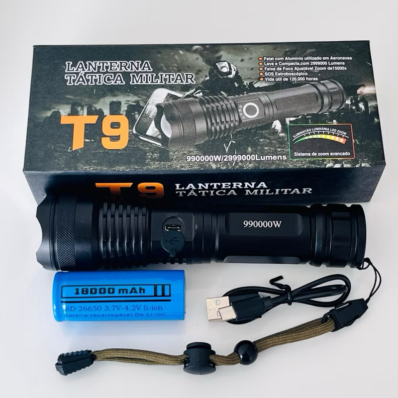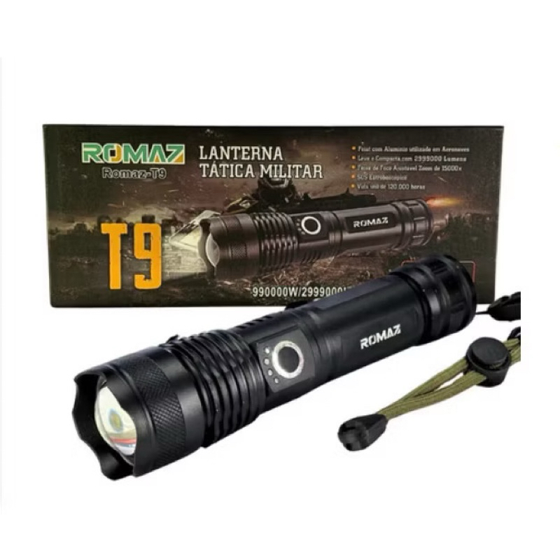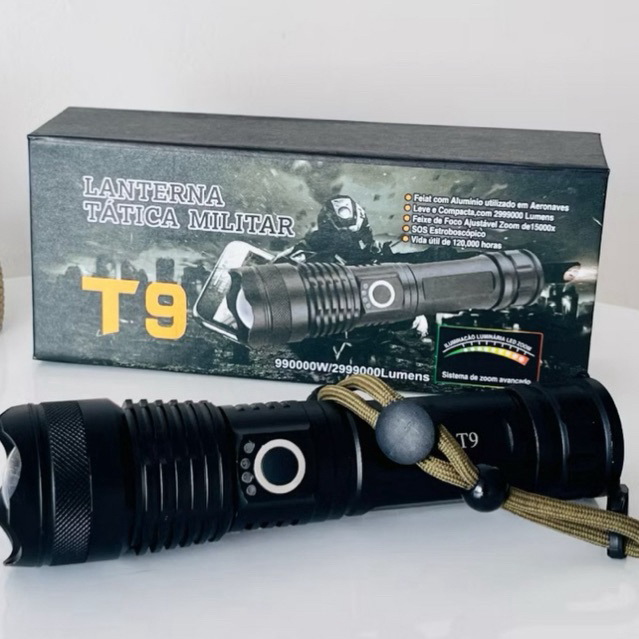 Lanterna Tática Militar LED T9 - Potência e Durabilidade com Zoom e 5 Modos de Funcionamento
