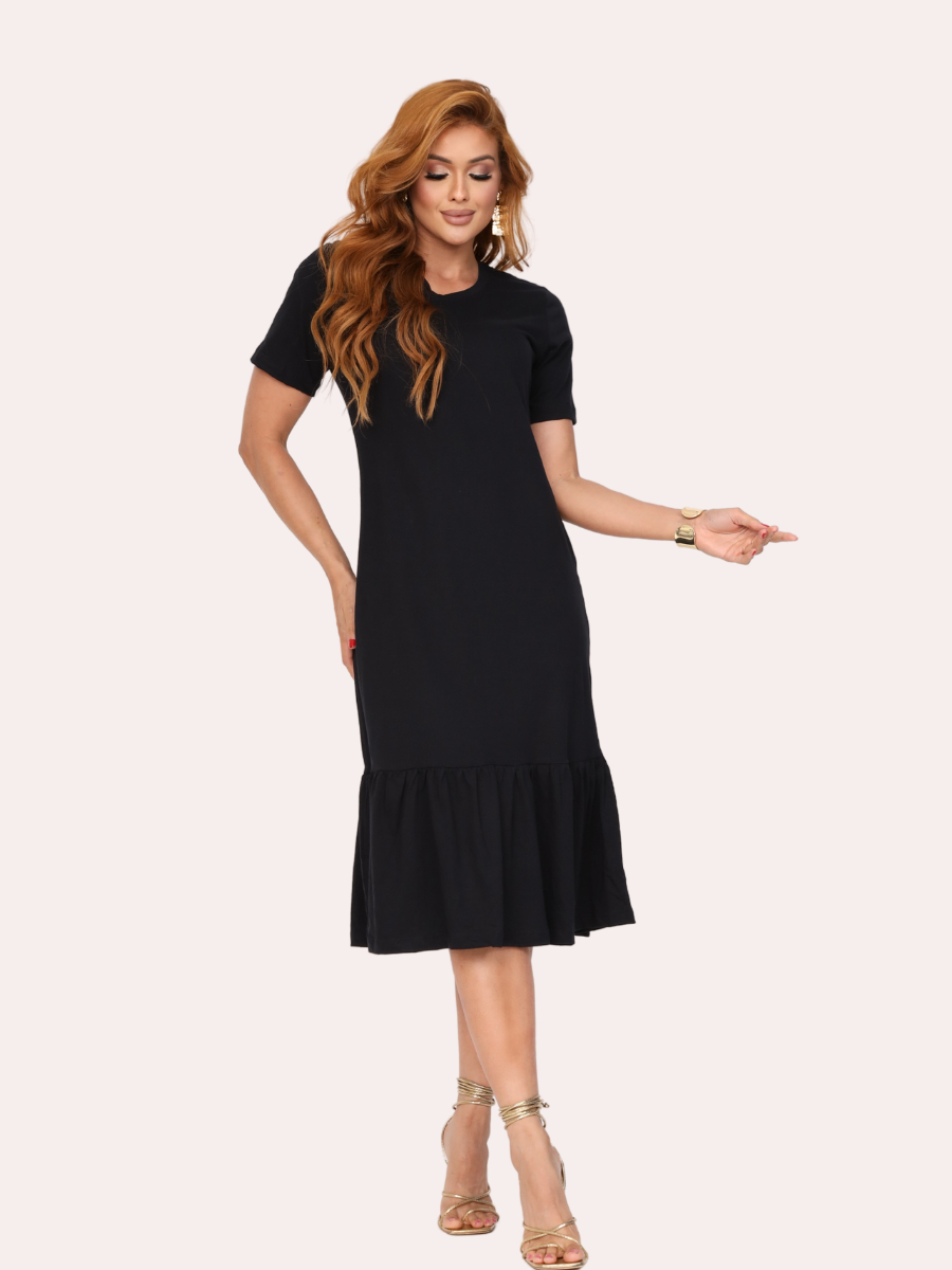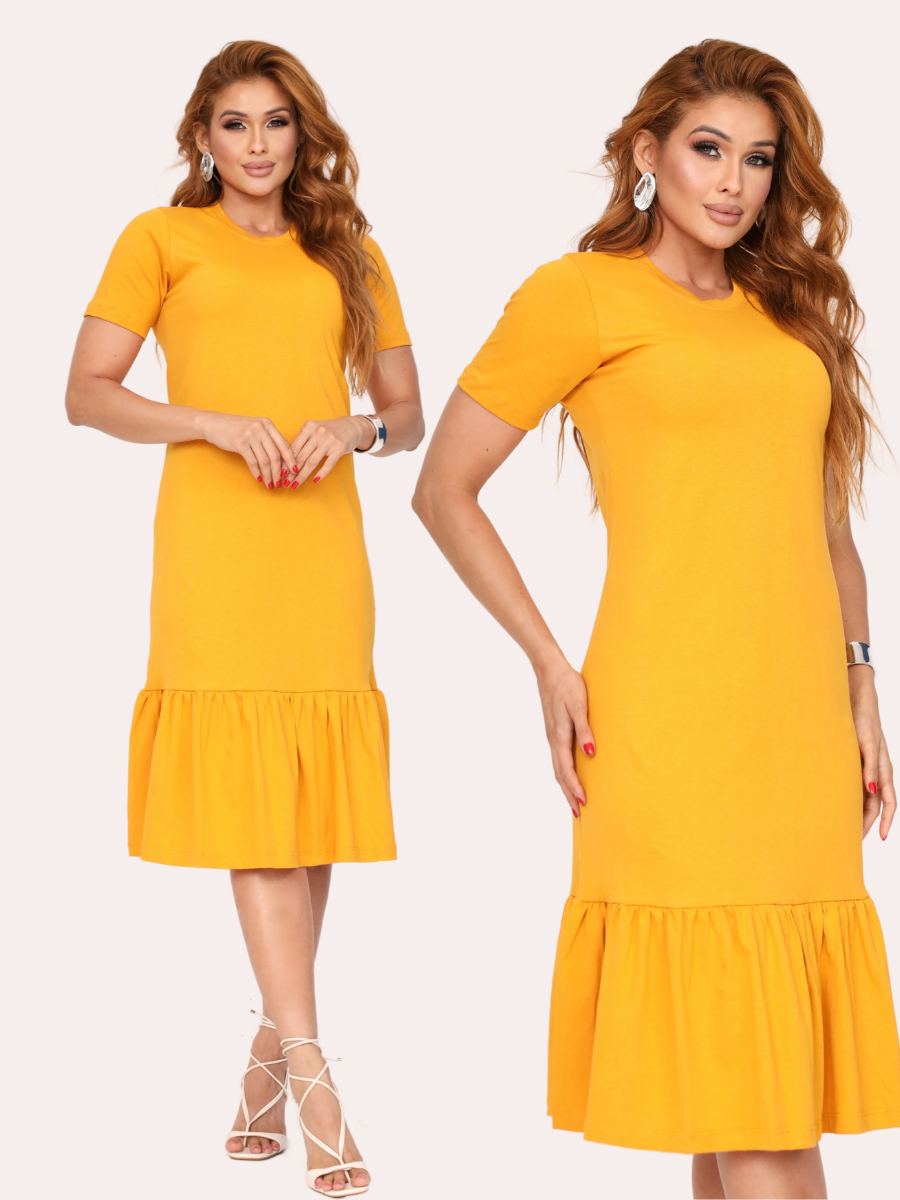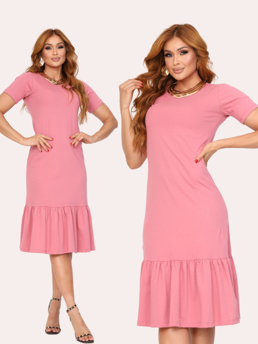 Vestido Feminino Midi Soltinho Moda Evangélica Manga Curta Com Babado Malha Algodão