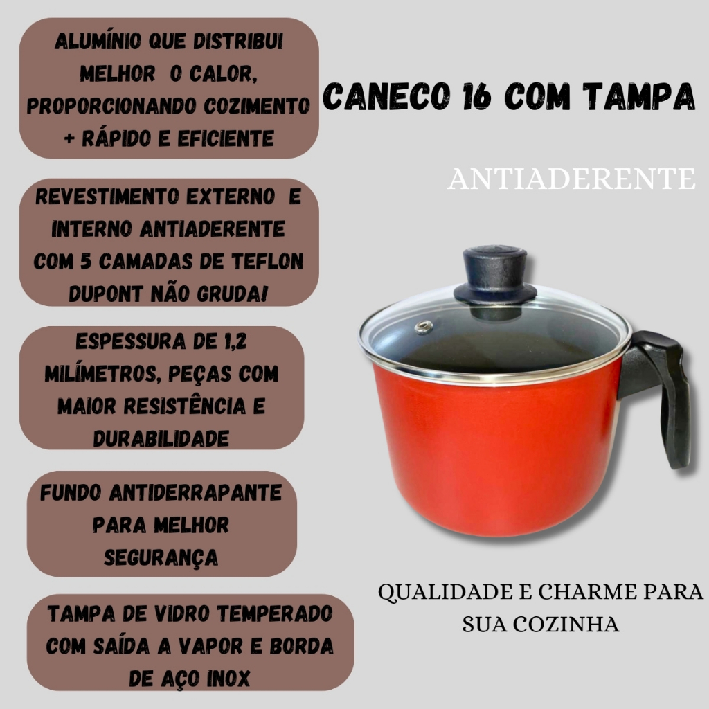 Caneco Fervedor 16 Cm Antiaderente Teflon Com Tampa De Vidro