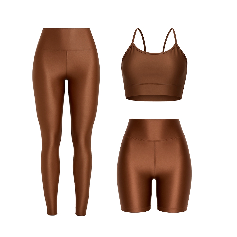 Kit 3 peças fitness feminino – conjunto academia com legging, short e top em malha trilobal canelada brilhosa