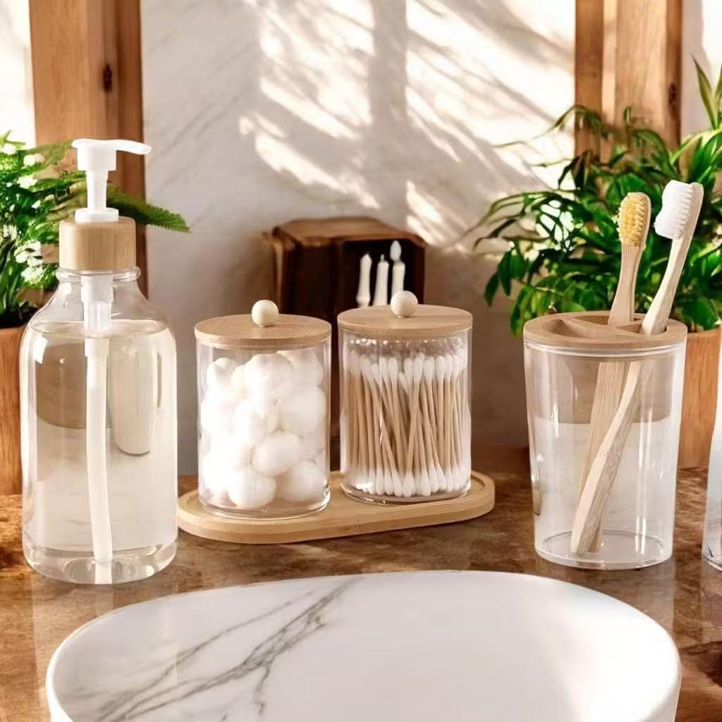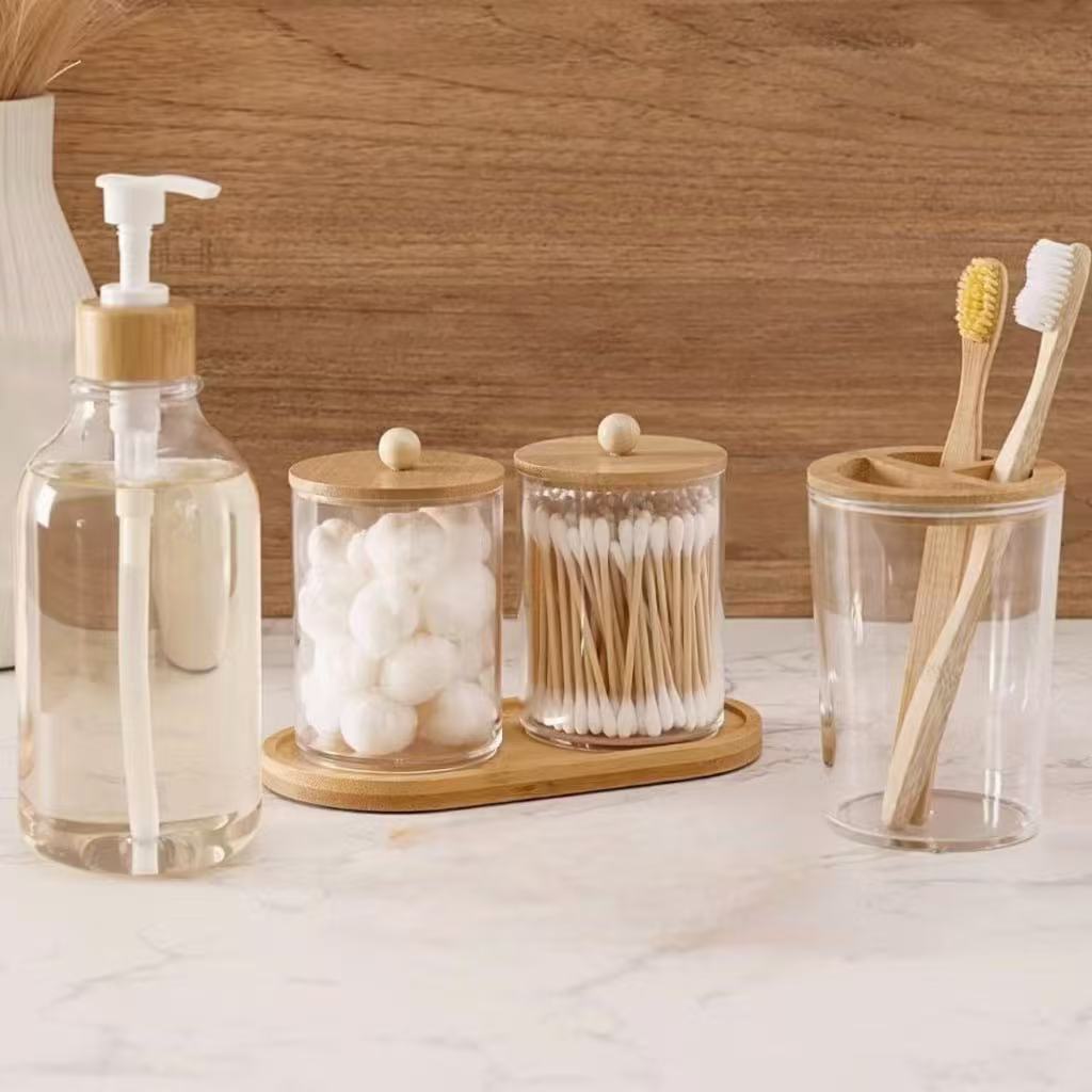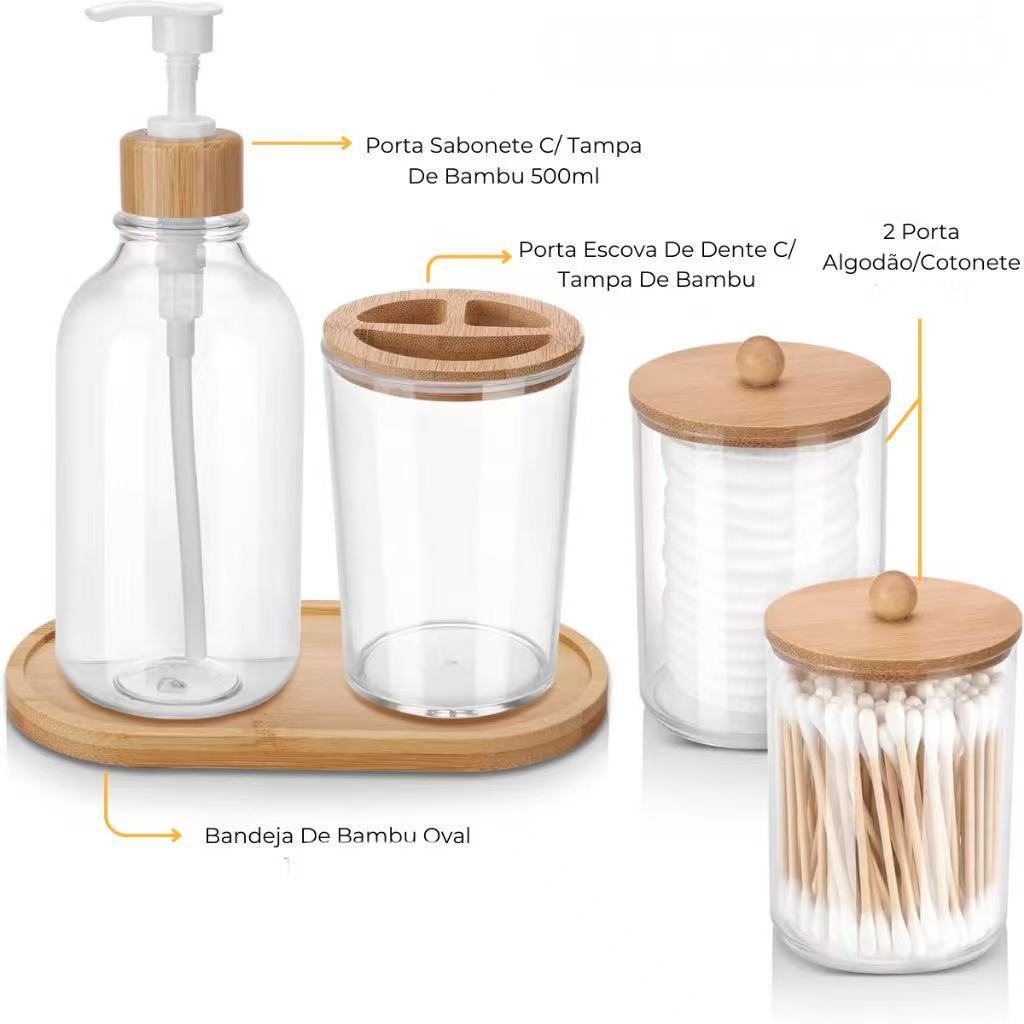 Jogo de banheiro bambu 05 peças - porta algodão com base e tampa, sabonete e porta escova