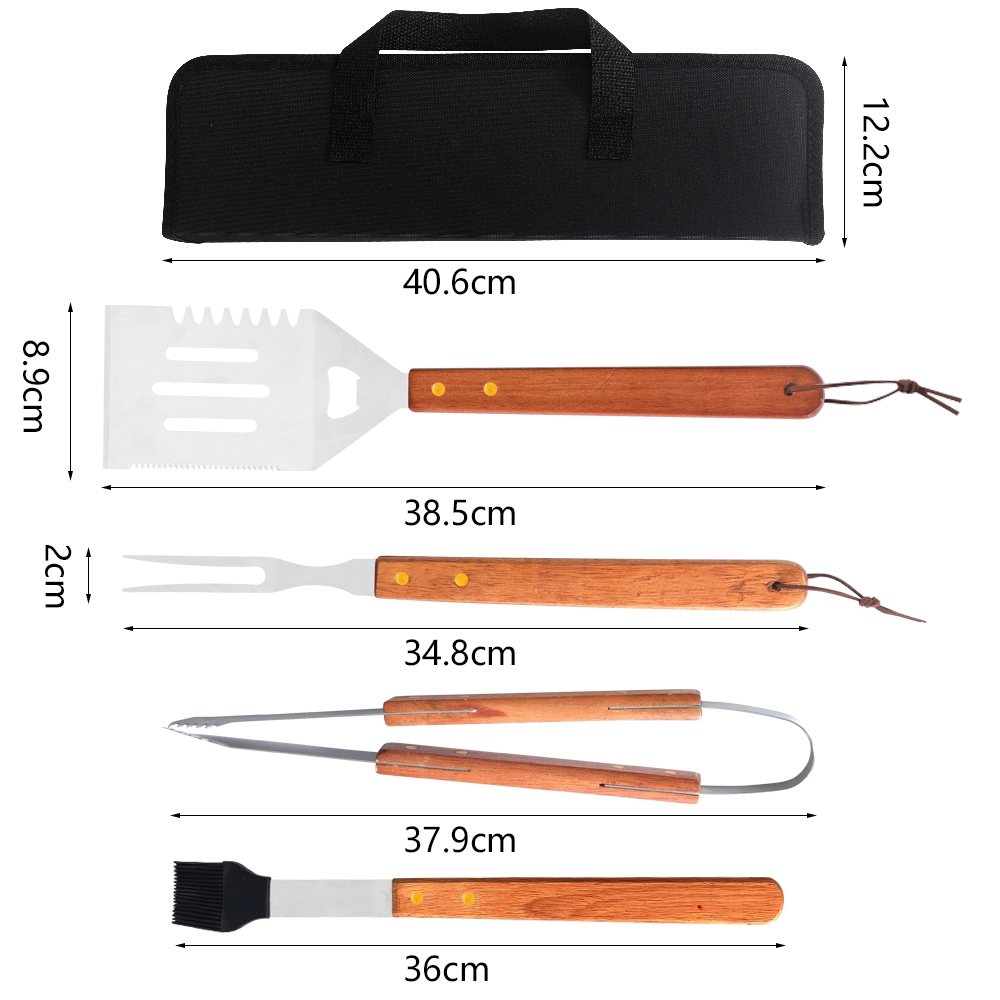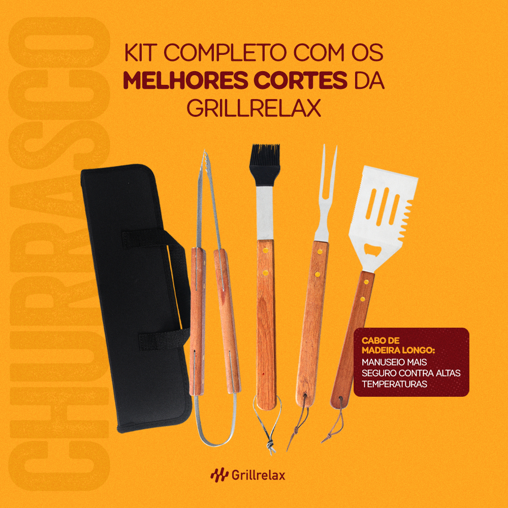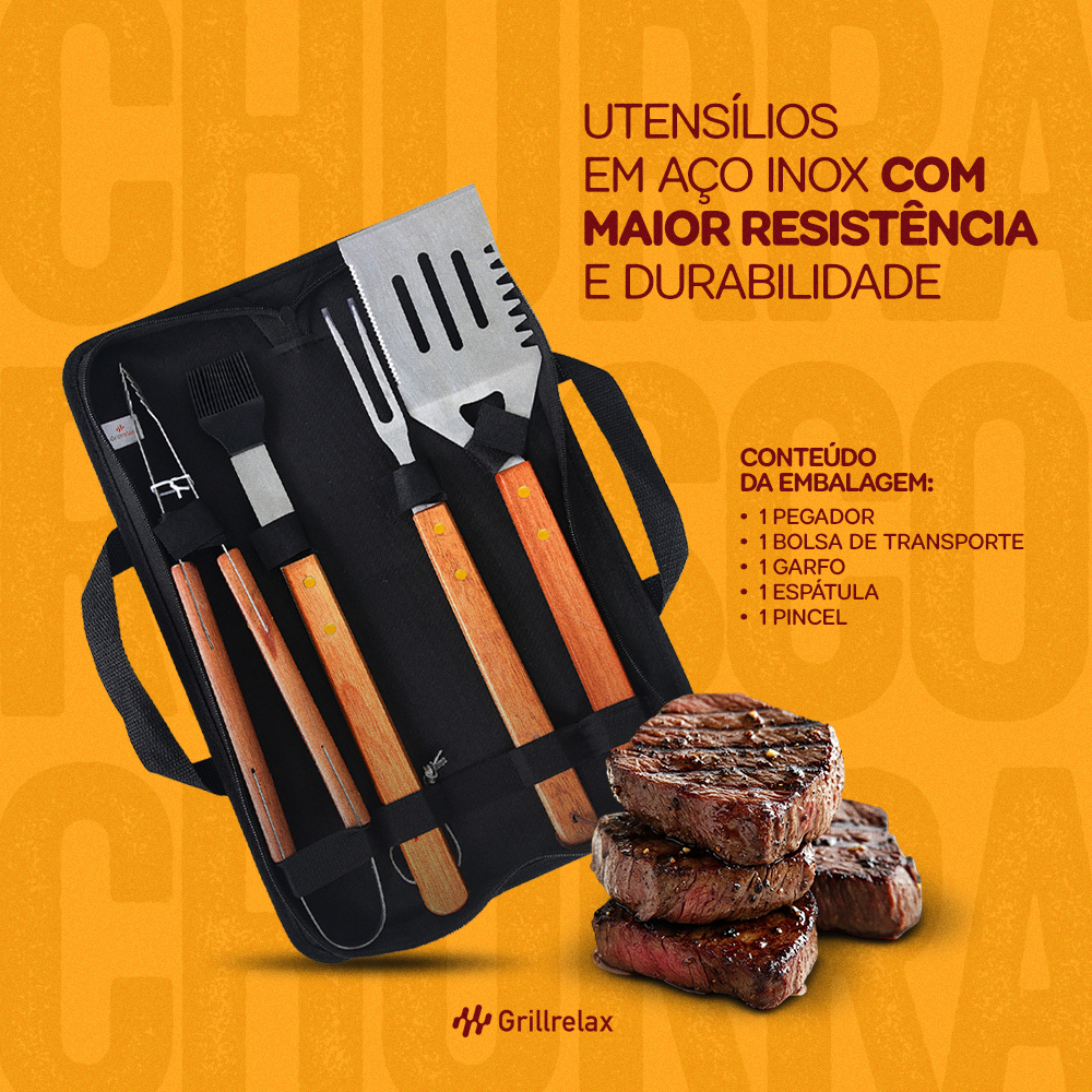 Kit Churrasco 5 Peças Maleta de transporte ChurrascoPegador Garfo Espátula Pincel Aço Inox Grillrelax