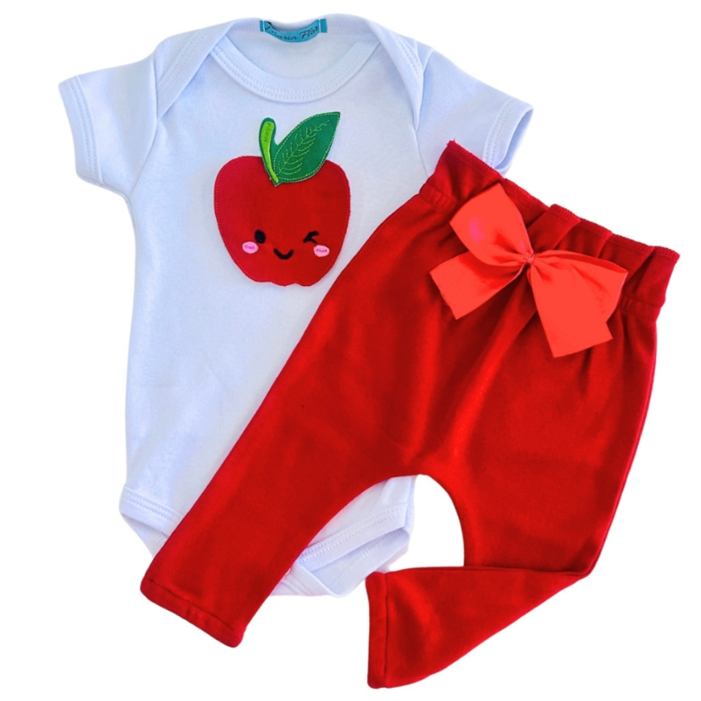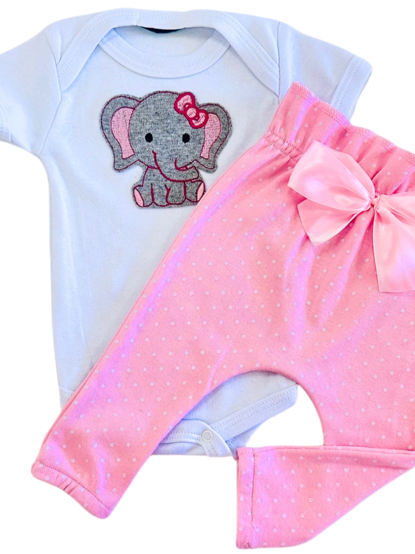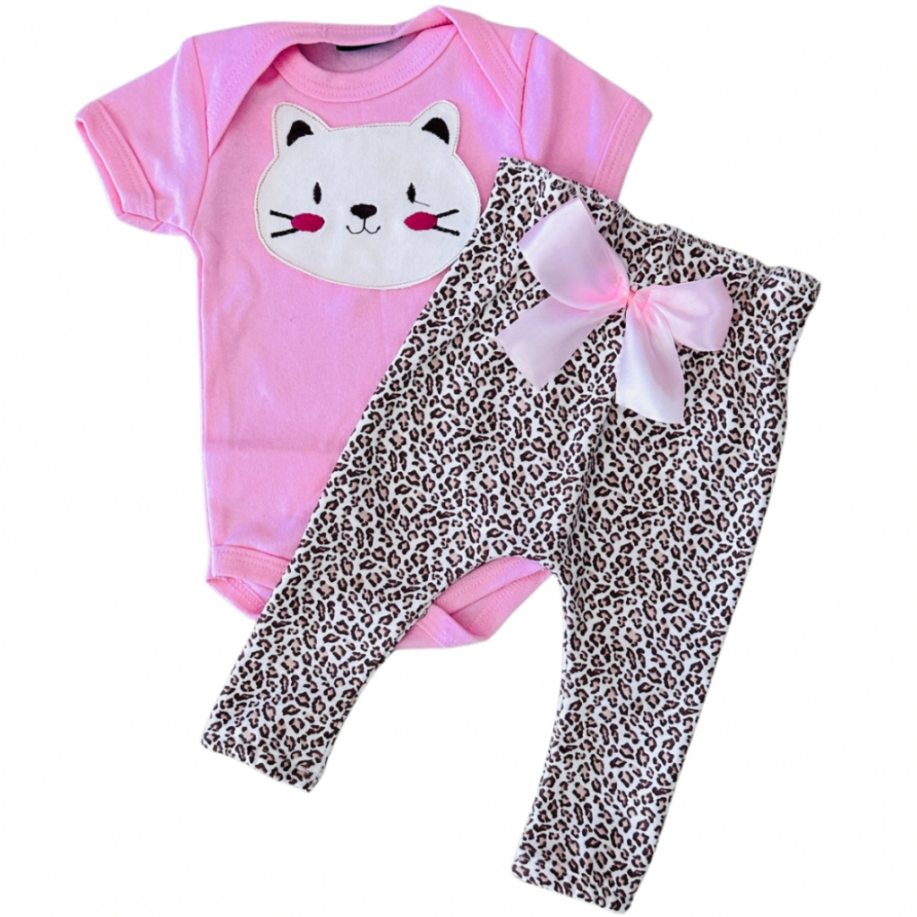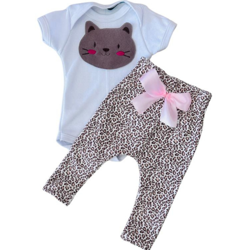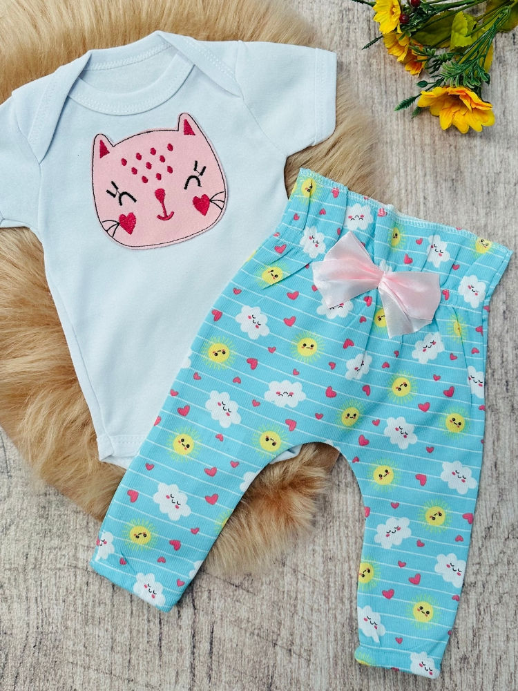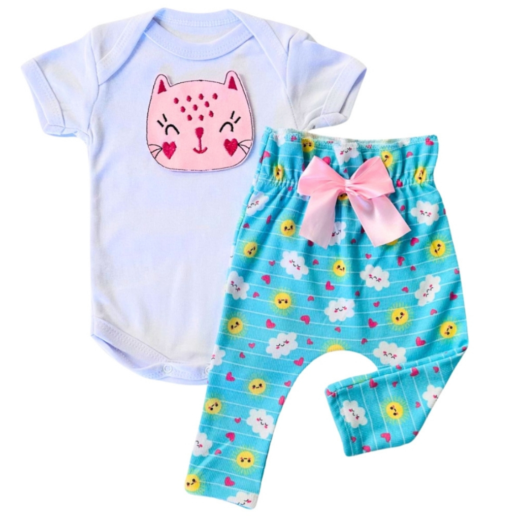 Conjunto Roupa Menina Bebê Algodão Manga Curta com Aplique Bordado Calça e Body Roupinha Bebês luxo