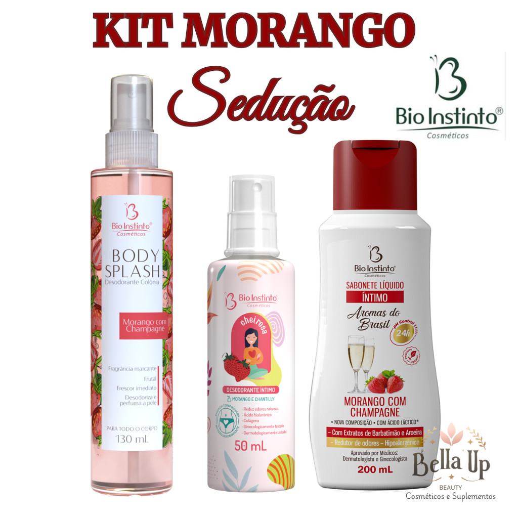 Kit Banho Morango com Champagne- Bio Instinto Sab Intimo/ Body Splash/ Desodorante Intimo