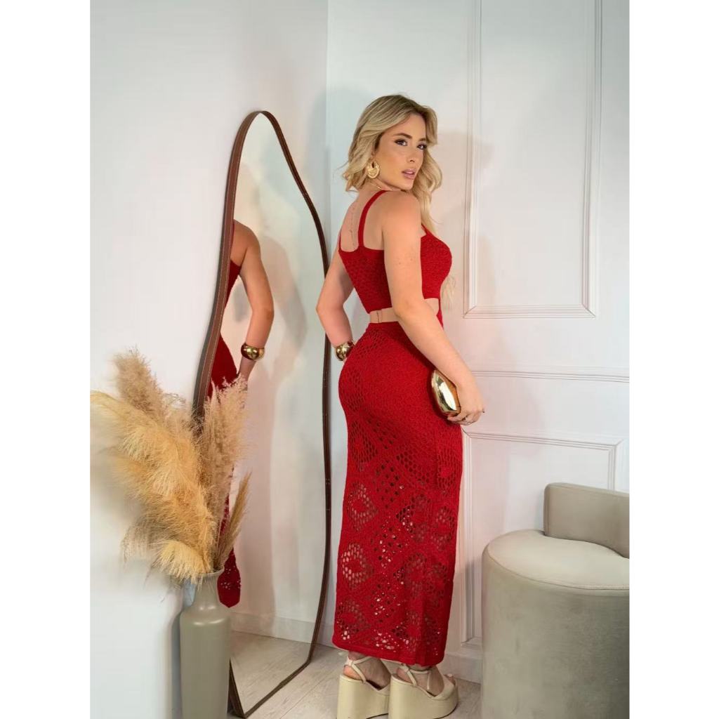 Vestido Longo Tricô Modal Premium Alças Largas Recortes Vazados na Cintura tamanho M 40