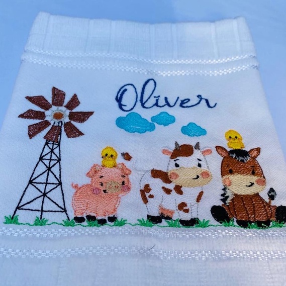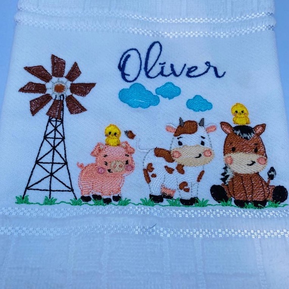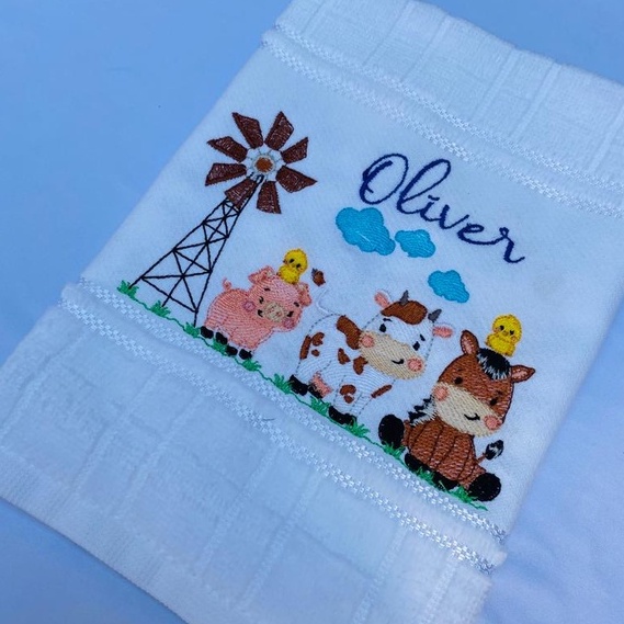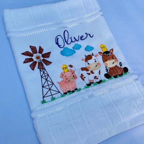 Toalha Bordada Personalizada Fazenda Cata-vento Porquinho Vaquinha Cavalinho com Nome