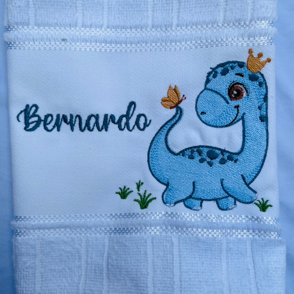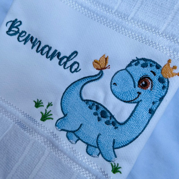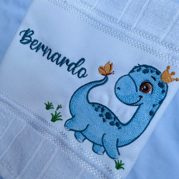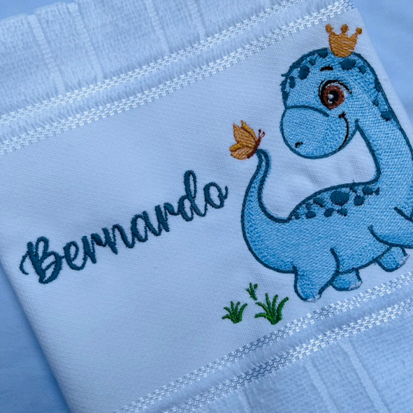 Toalha Bordada Personalizada Dinossauro Azul Coroa com Nome