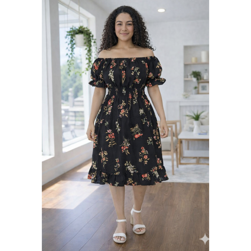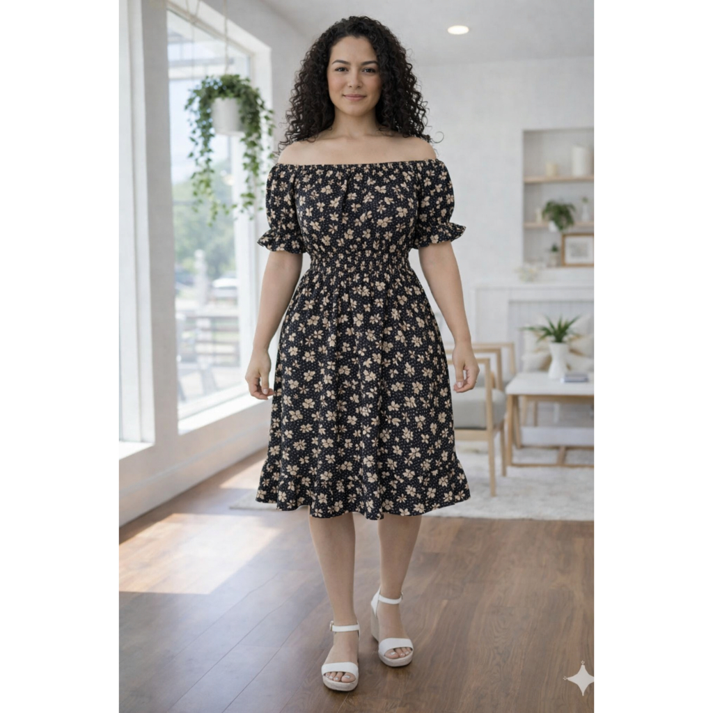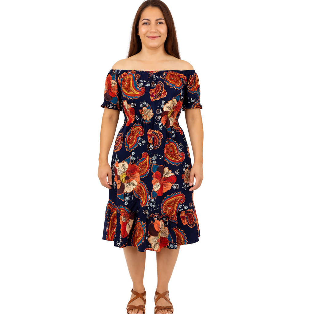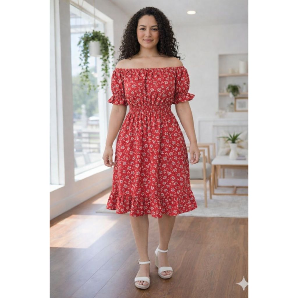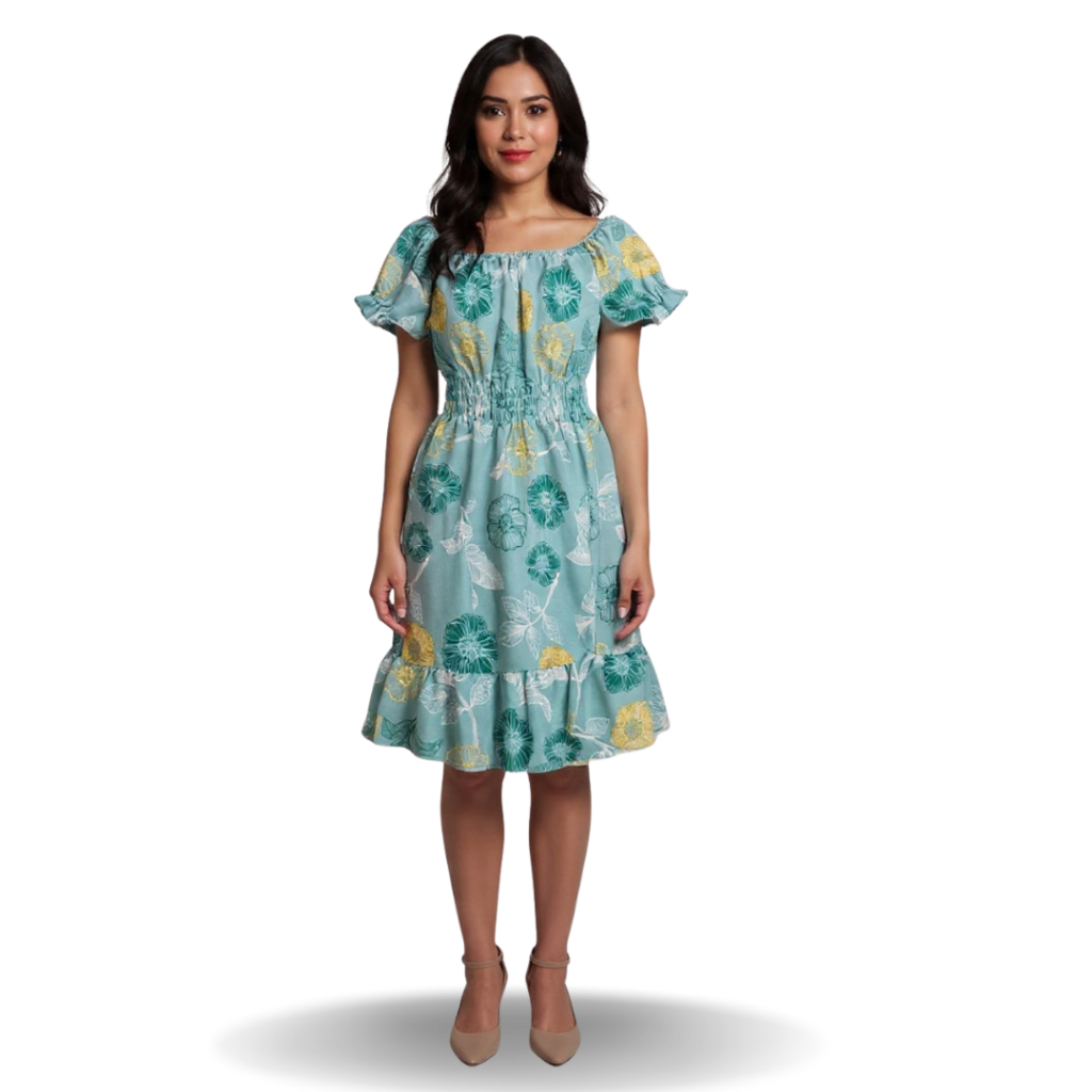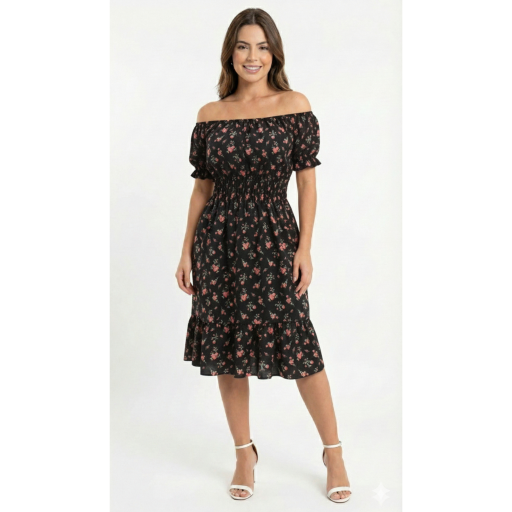 Vestido feminino verão estampado ciganinha cintura com elástico, babado na barra e mangas