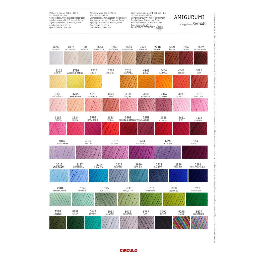 Fio Amigurumi Círculo 100% Algodão 254m PROMOÇÃO - 1ª Cartela Cores
