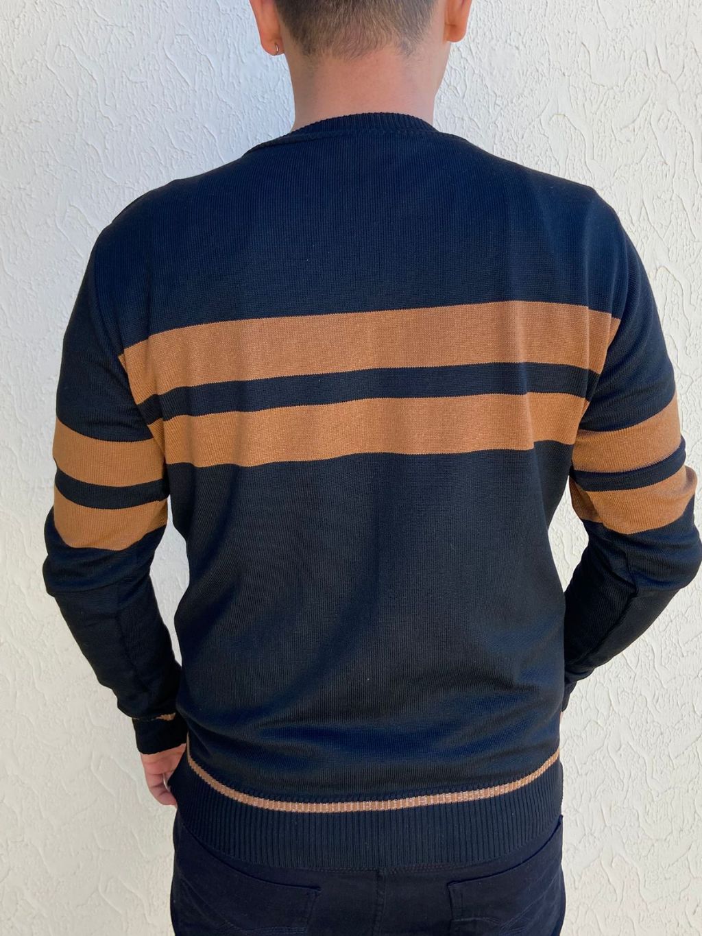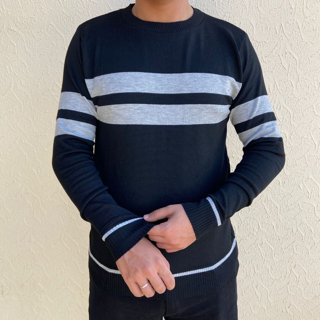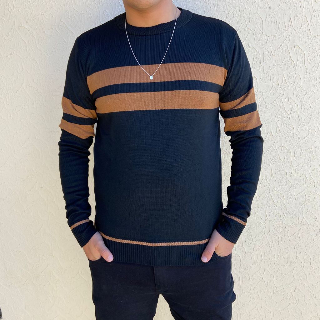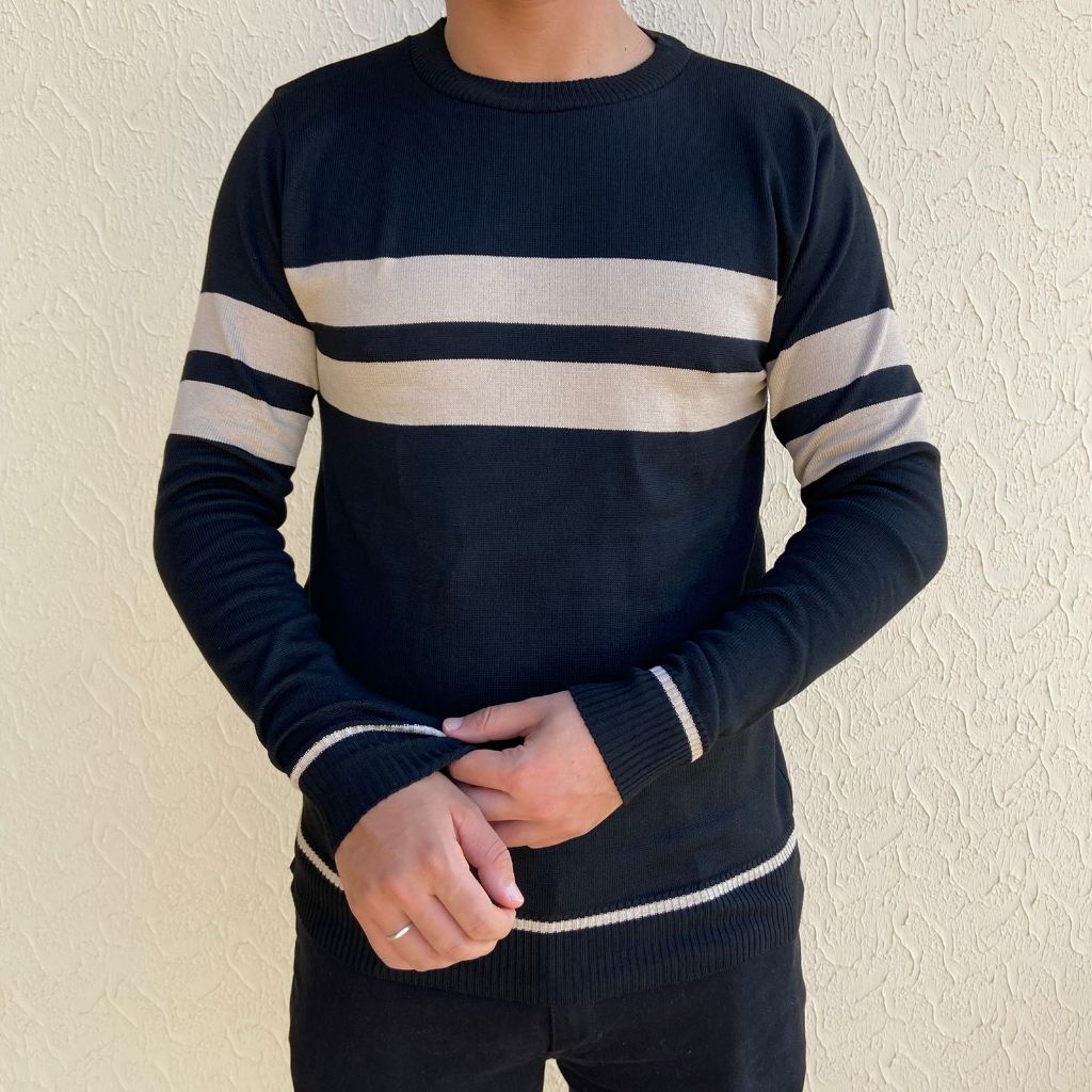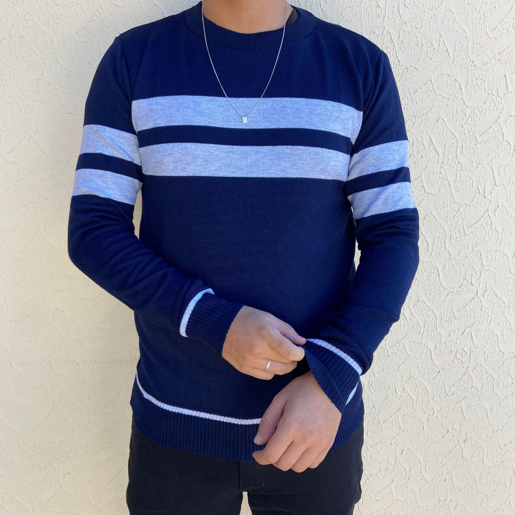 Suéter Masculino Blusa de Frio Tricot Listrada Tricô Inverno Gola Redonda Manga Longa Elegante