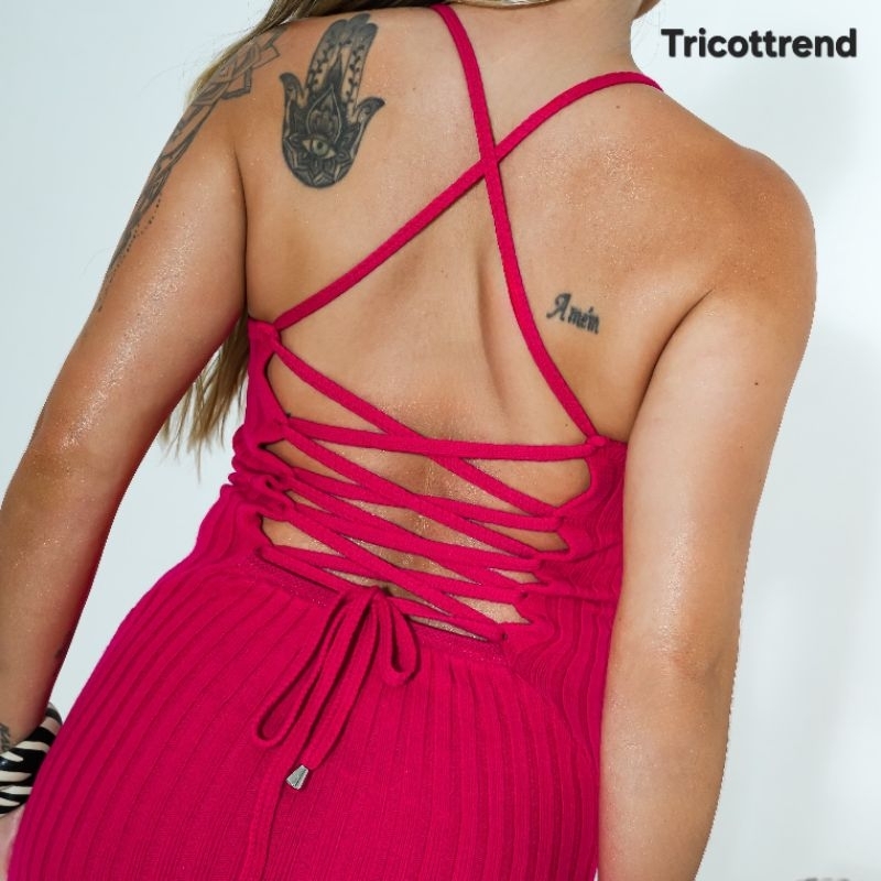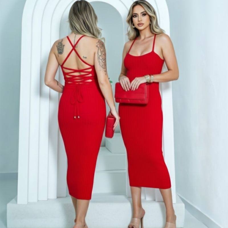 Vestido Midi Trançado nas Costas Tricot Modal Canelado tricô Premium Tendência Verão Festa Praia