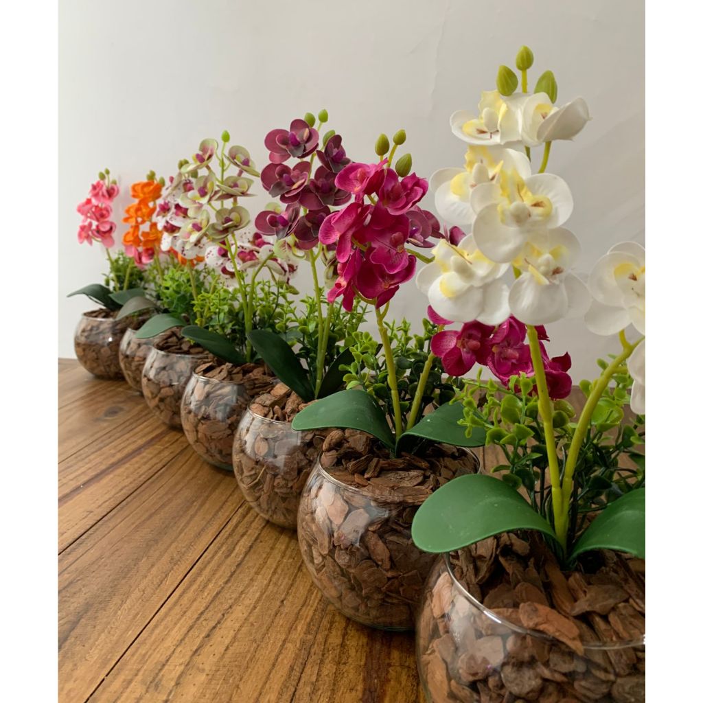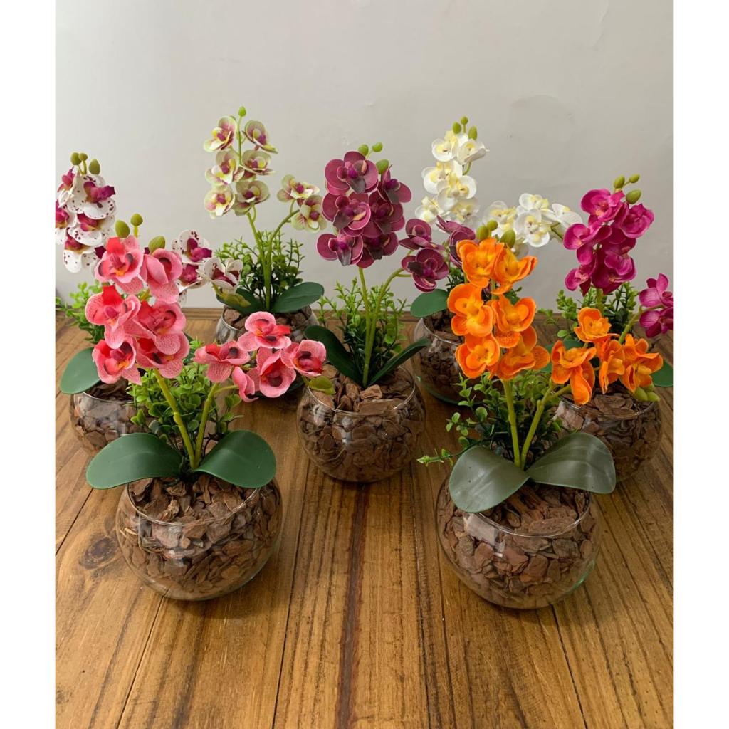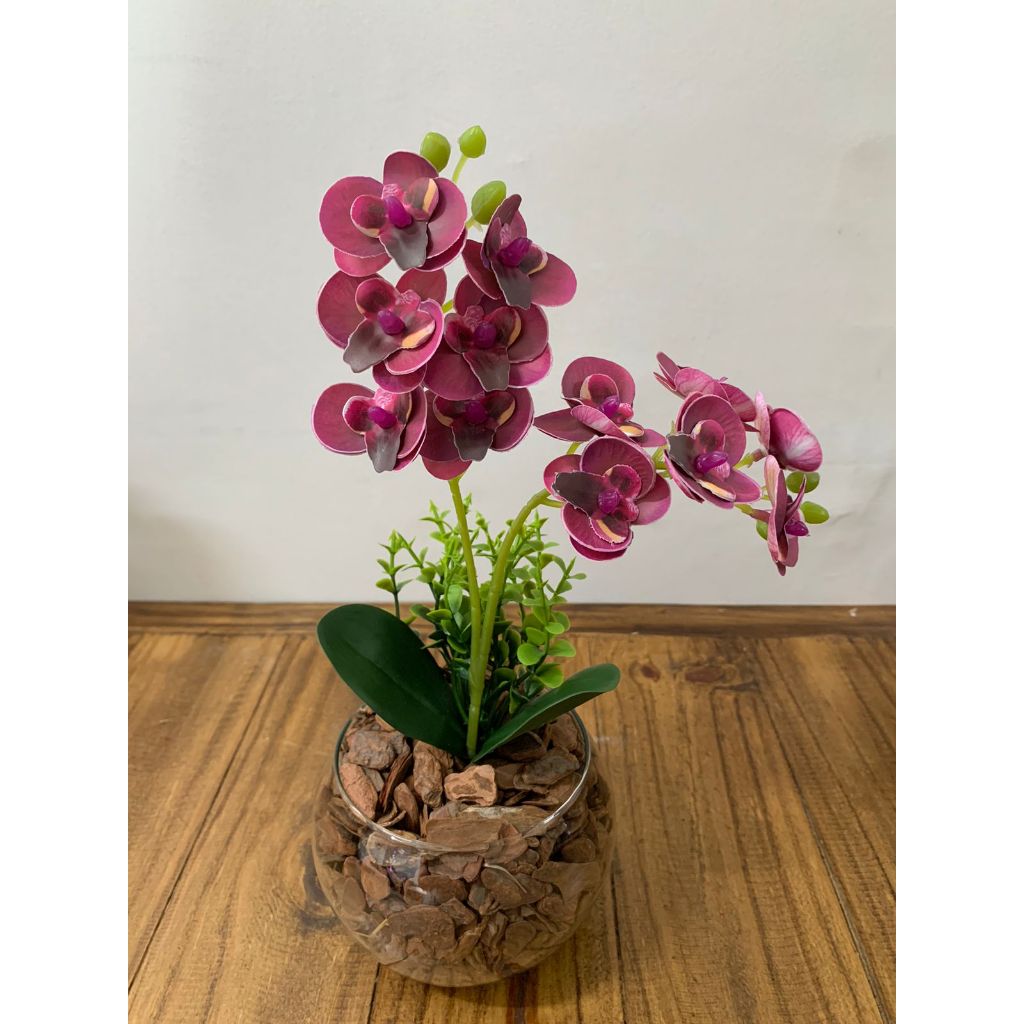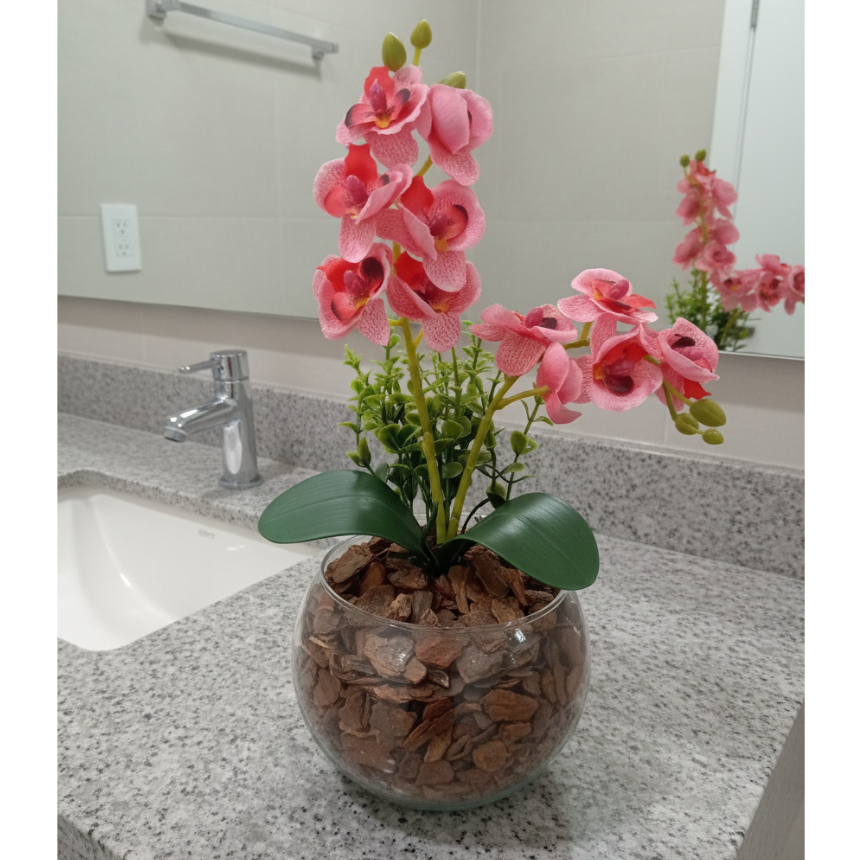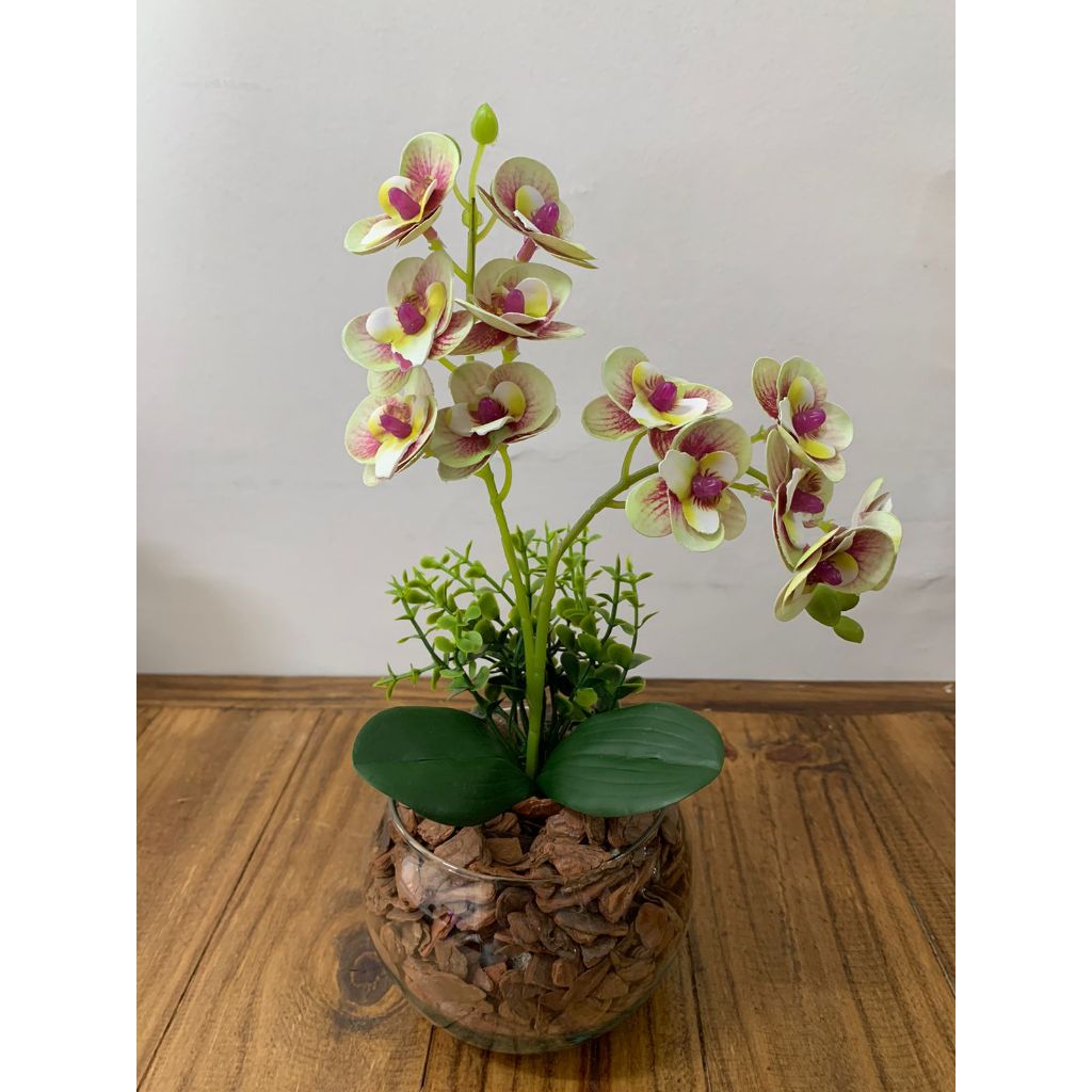 ARRANJO DE ORQUIDEA NO VASO DE VIDRO COM FOLHAGENS - 30 CM DE ALTURA