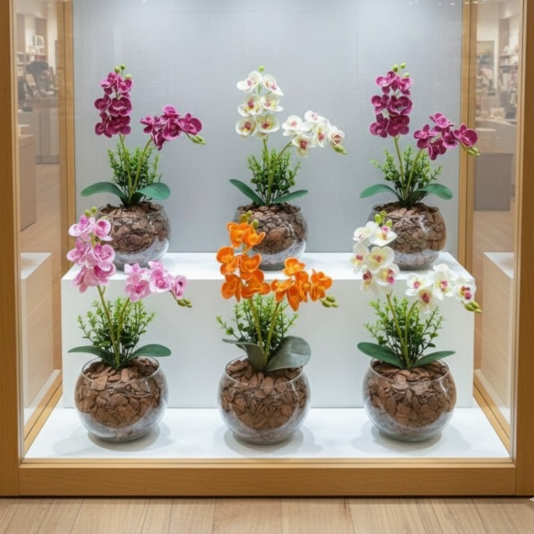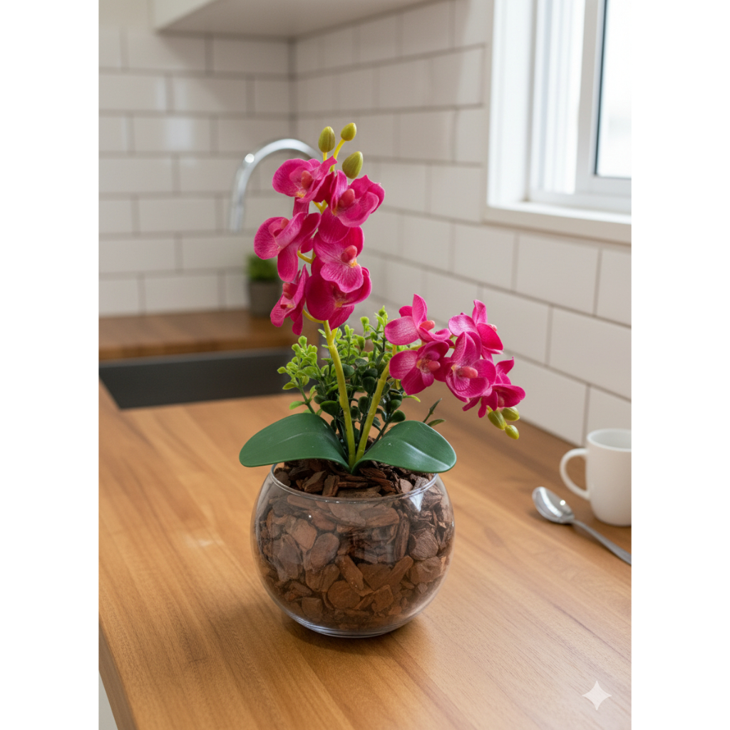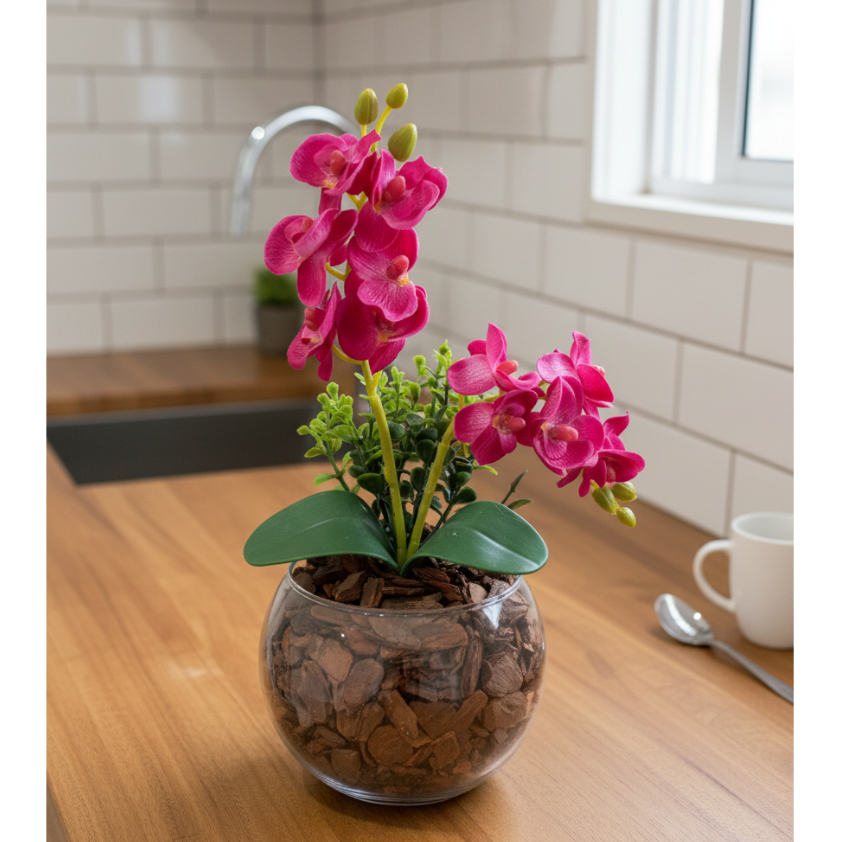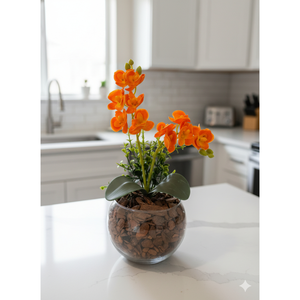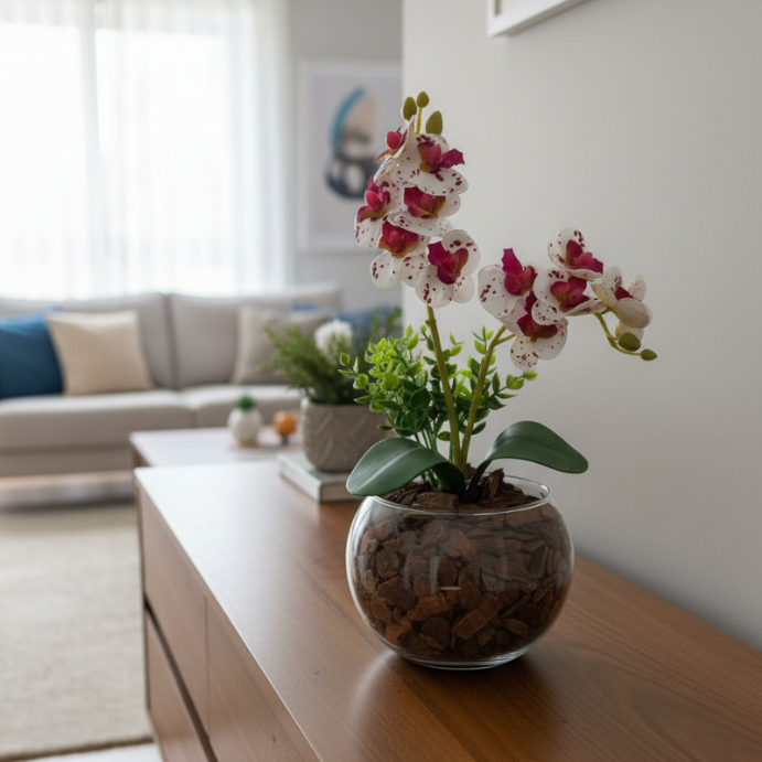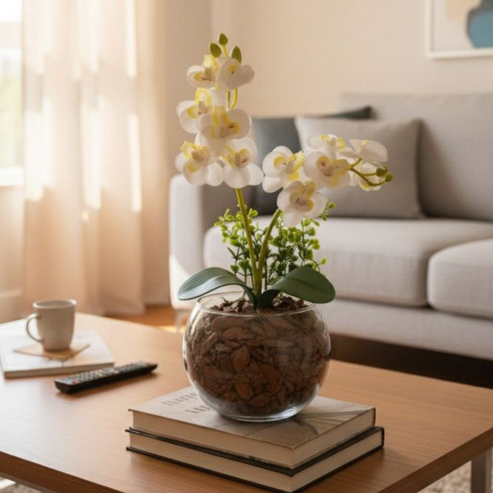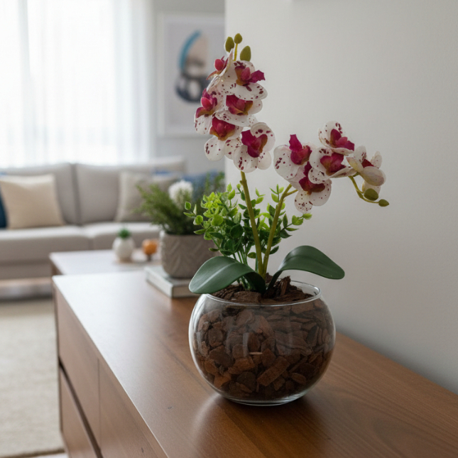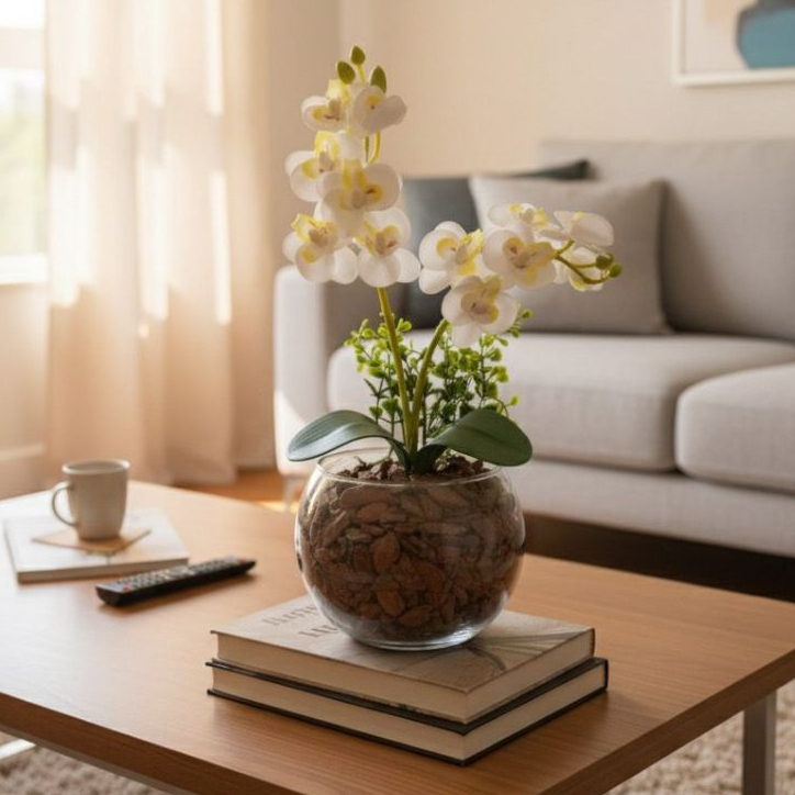 ARRANJO DE ORQUIDEA NO VASO DE VIDRO COM FOLHAGENS - 30 CM DE ALTURA