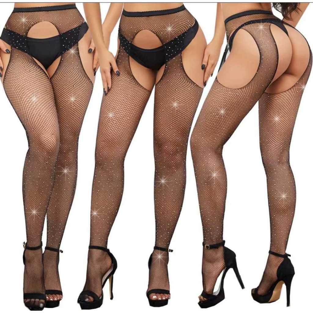 Meia calça preta arrastão com strass meia cinta liga com strass