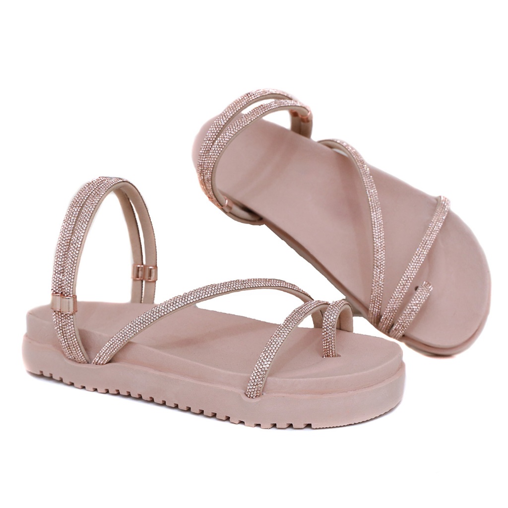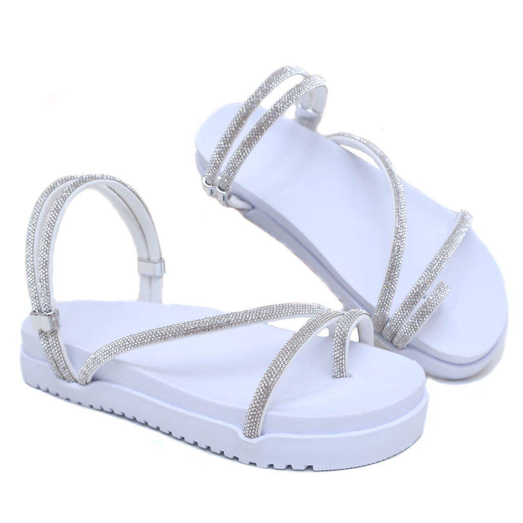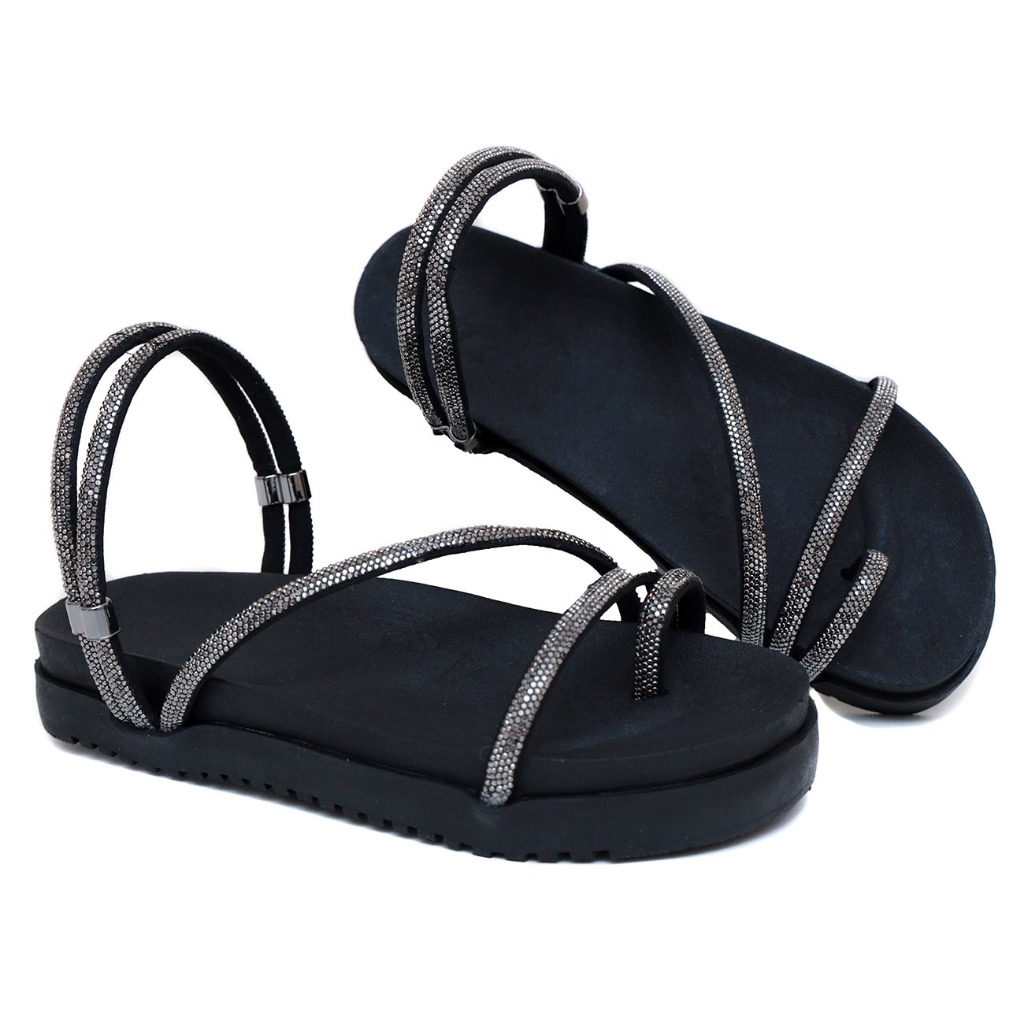 Sandalia papete feminina brilho com tira strass rasteira e amarrada 2 em 1