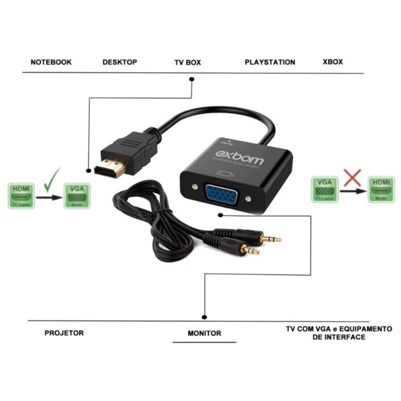 Cabo conversor HDMI para VGA Fêmea c/ áudio desbloqueado EXBOM CC-HV100