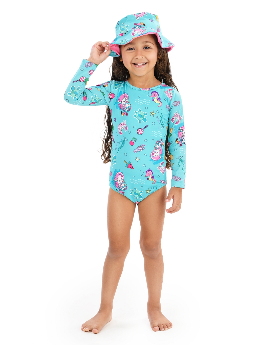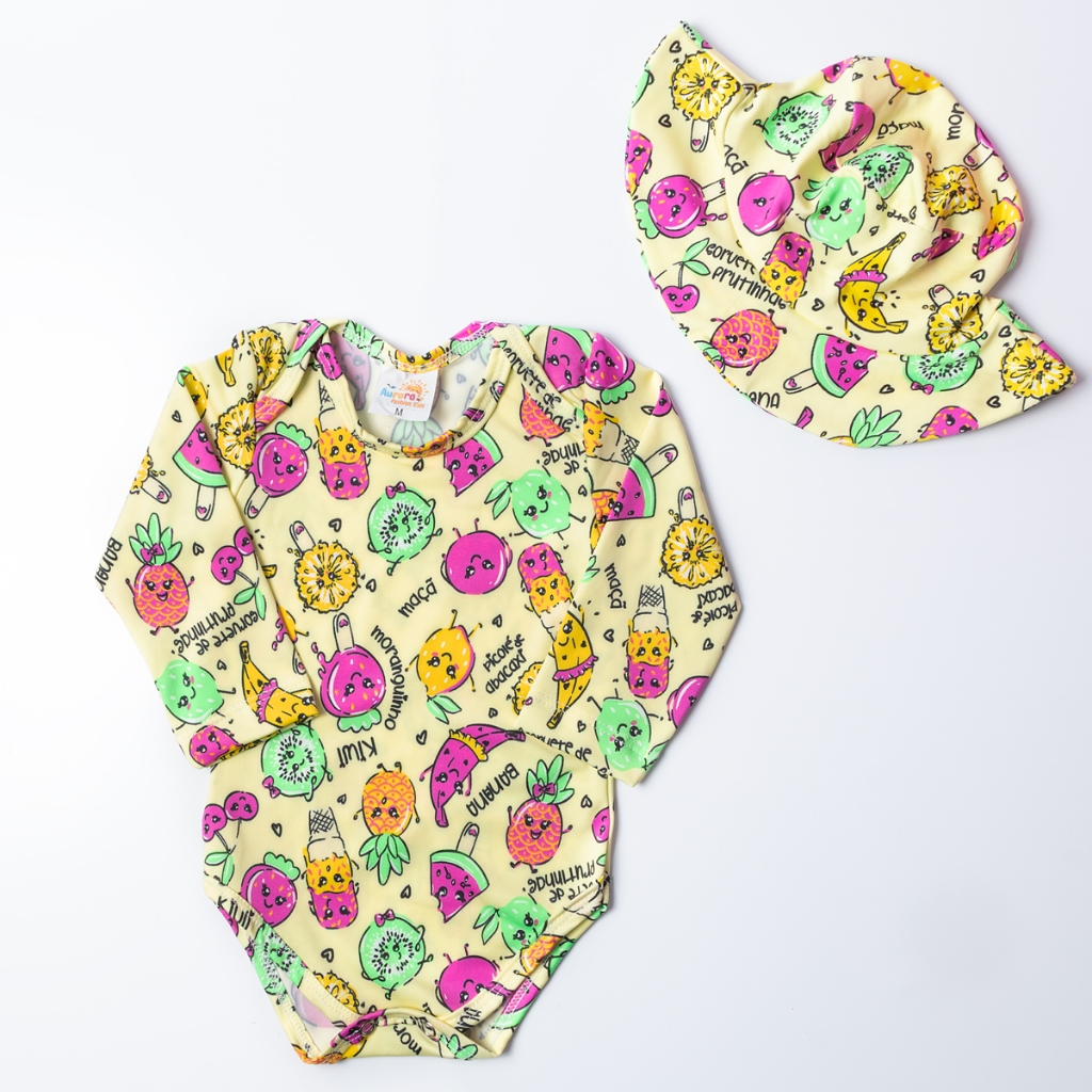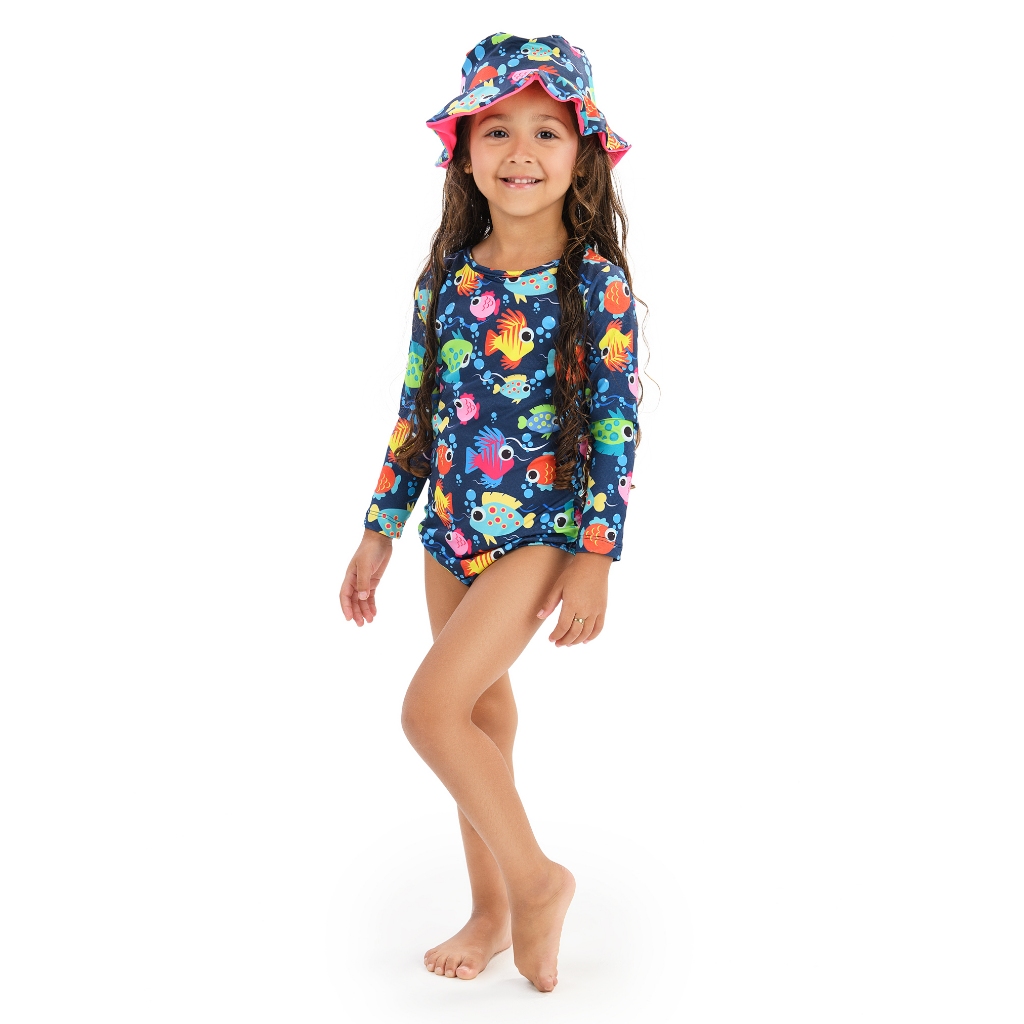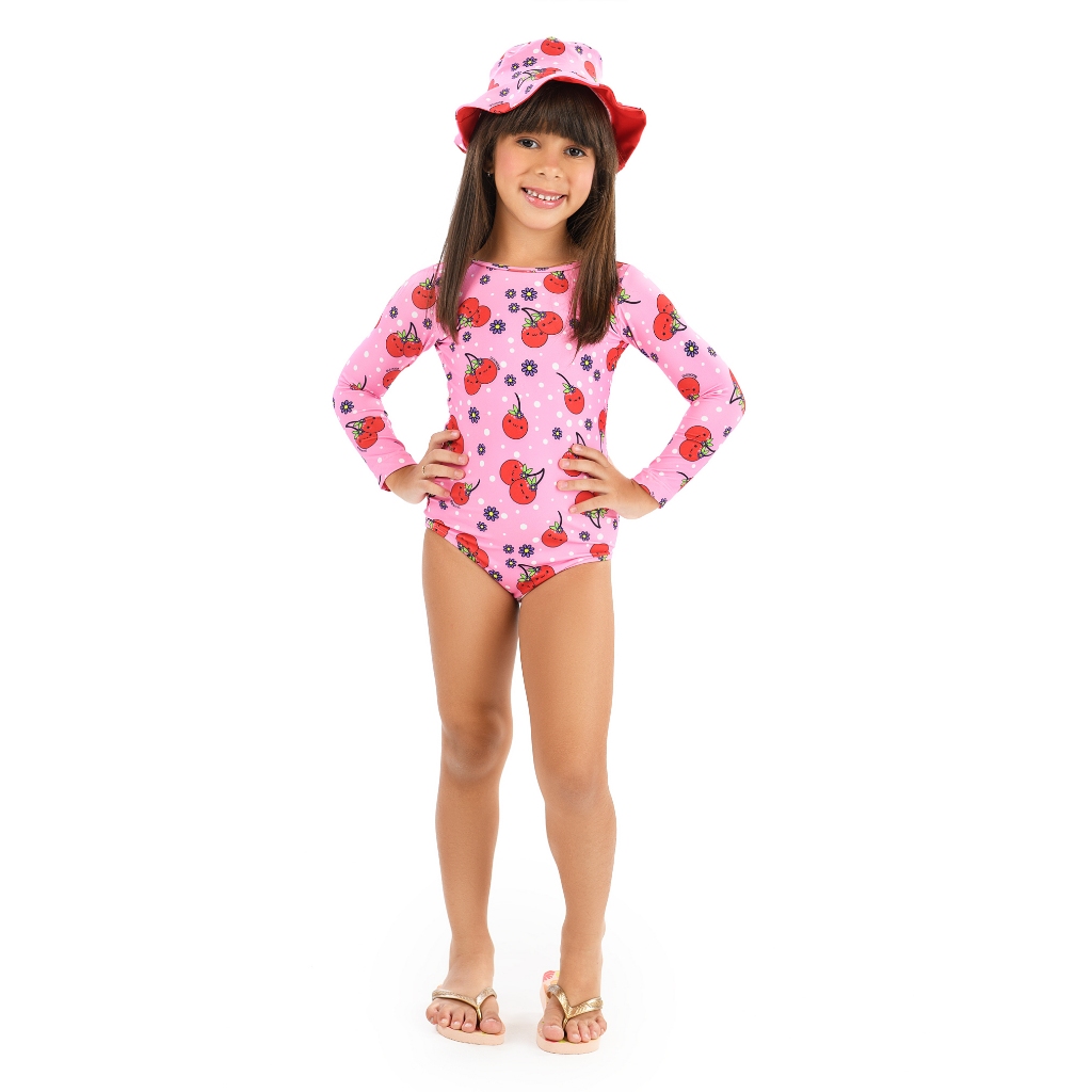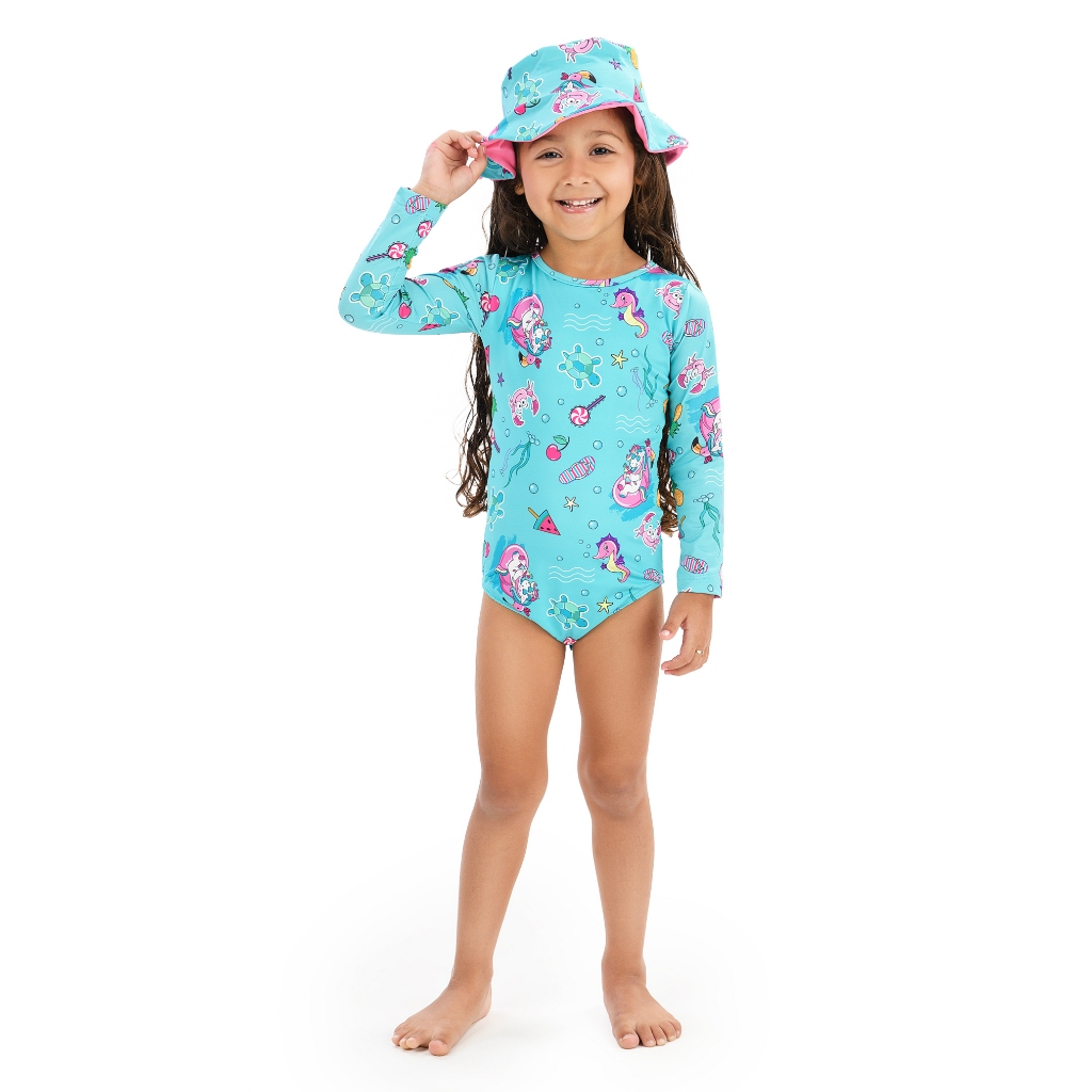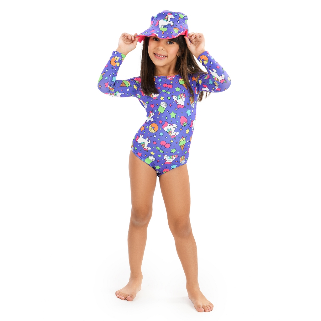 Maiô Body Manga Longa e Chapéu Com Proteção UV50+ Praia Verão Natação