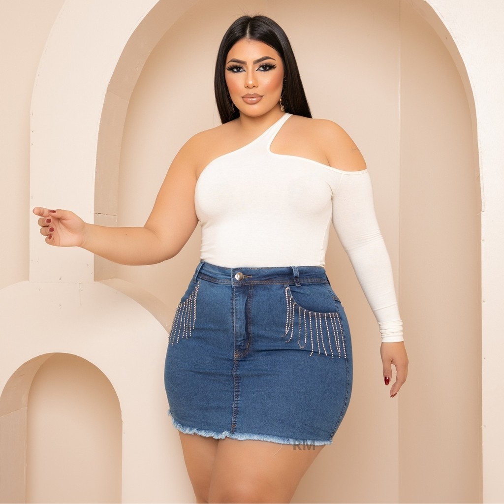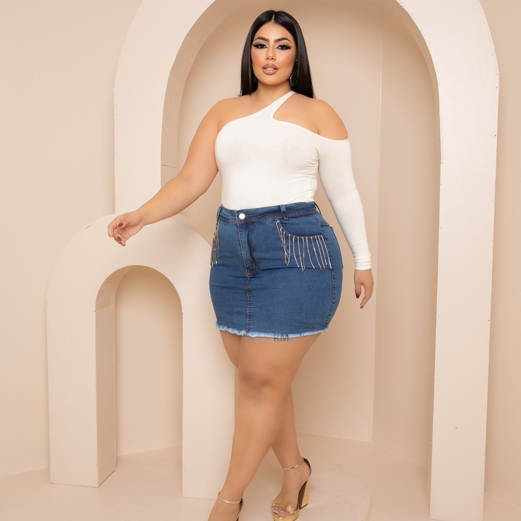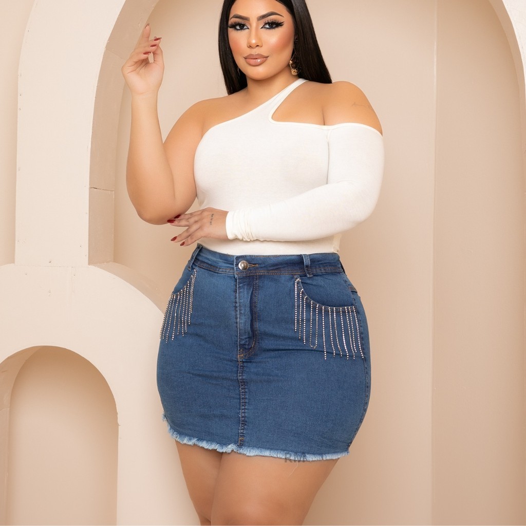 saia jeans feminina plus size c/ lycra detalhada com strass barra desfiada