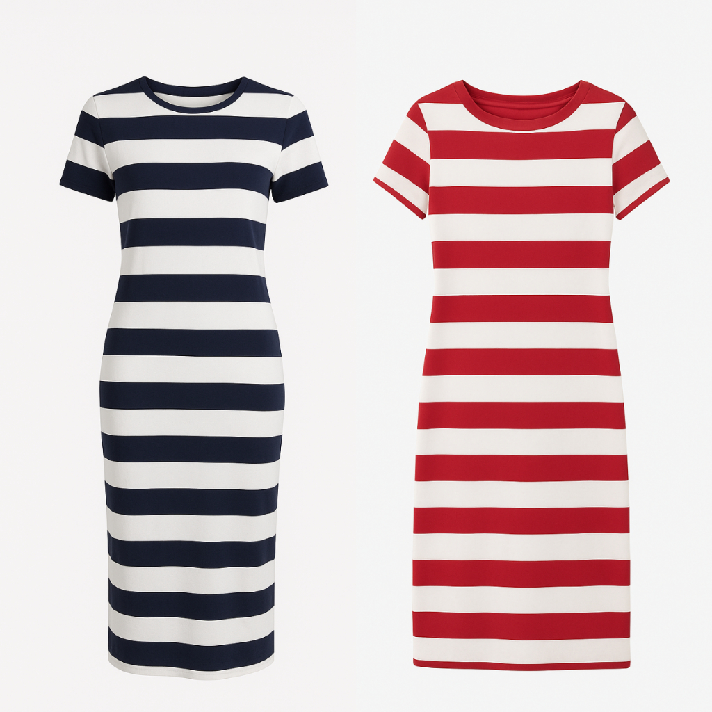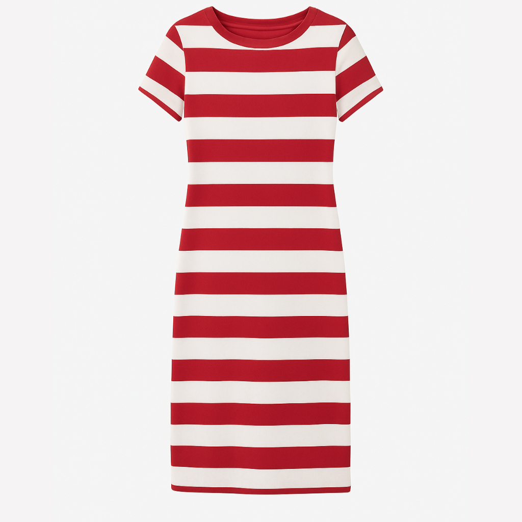 Vestido Listrado Midi Feminino Casual Elegante – Estilo Marinho/Vermelho – Tamanhos P ao GG