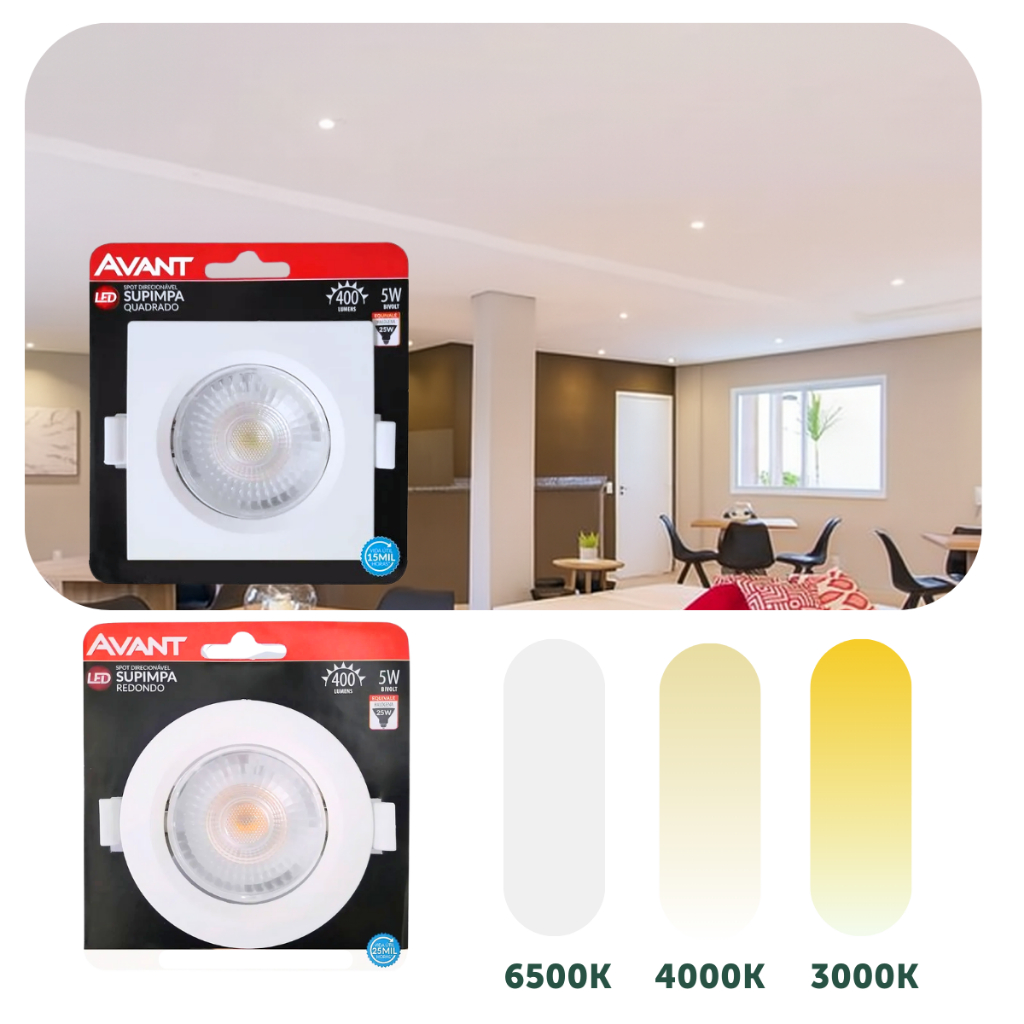 Kit 2 Spot Led Embutir 5w Quadrado Redondo 9cm Luminária Teto Gesso Forro Dicroica MR16 Avant