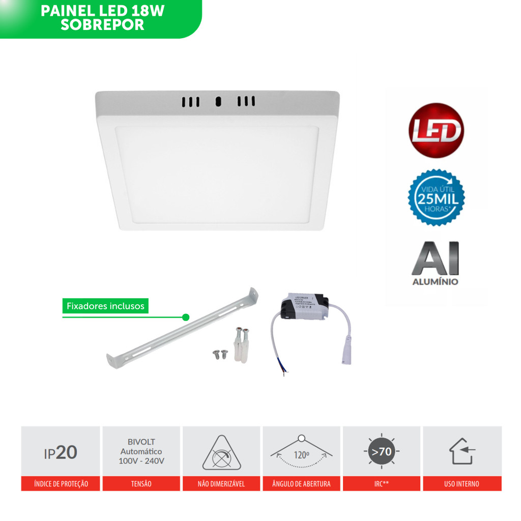 Painel de Led 18W Luminária Teto Quadrado Sobrepor Bivolt Taschibra Sala Cozinha Quarto