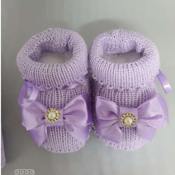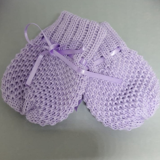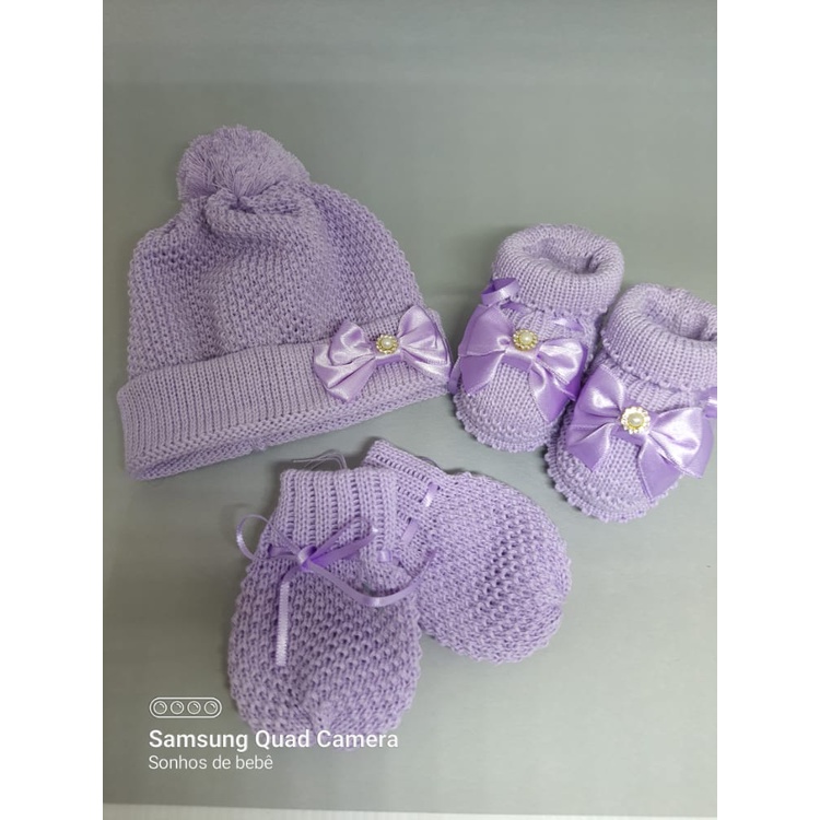 Kit Touca/Gorro Luva e Sapatinho Botinha Lilás bebê RN até 2 Meses em Tricô