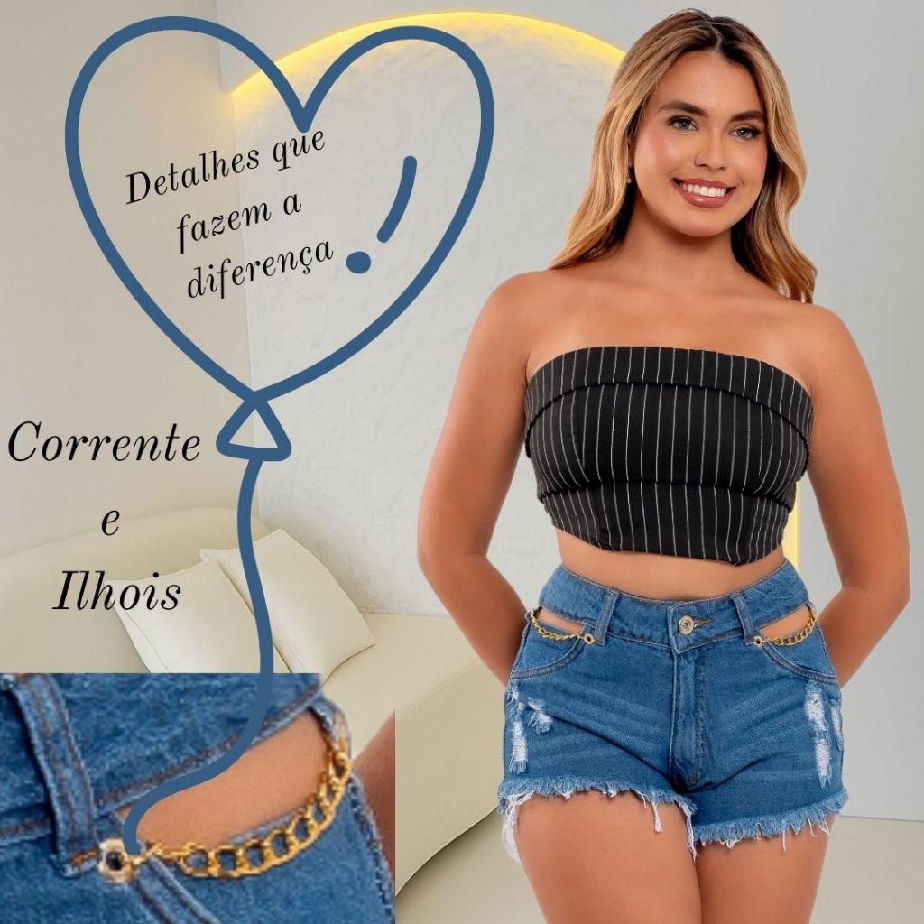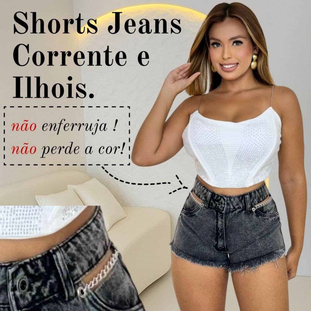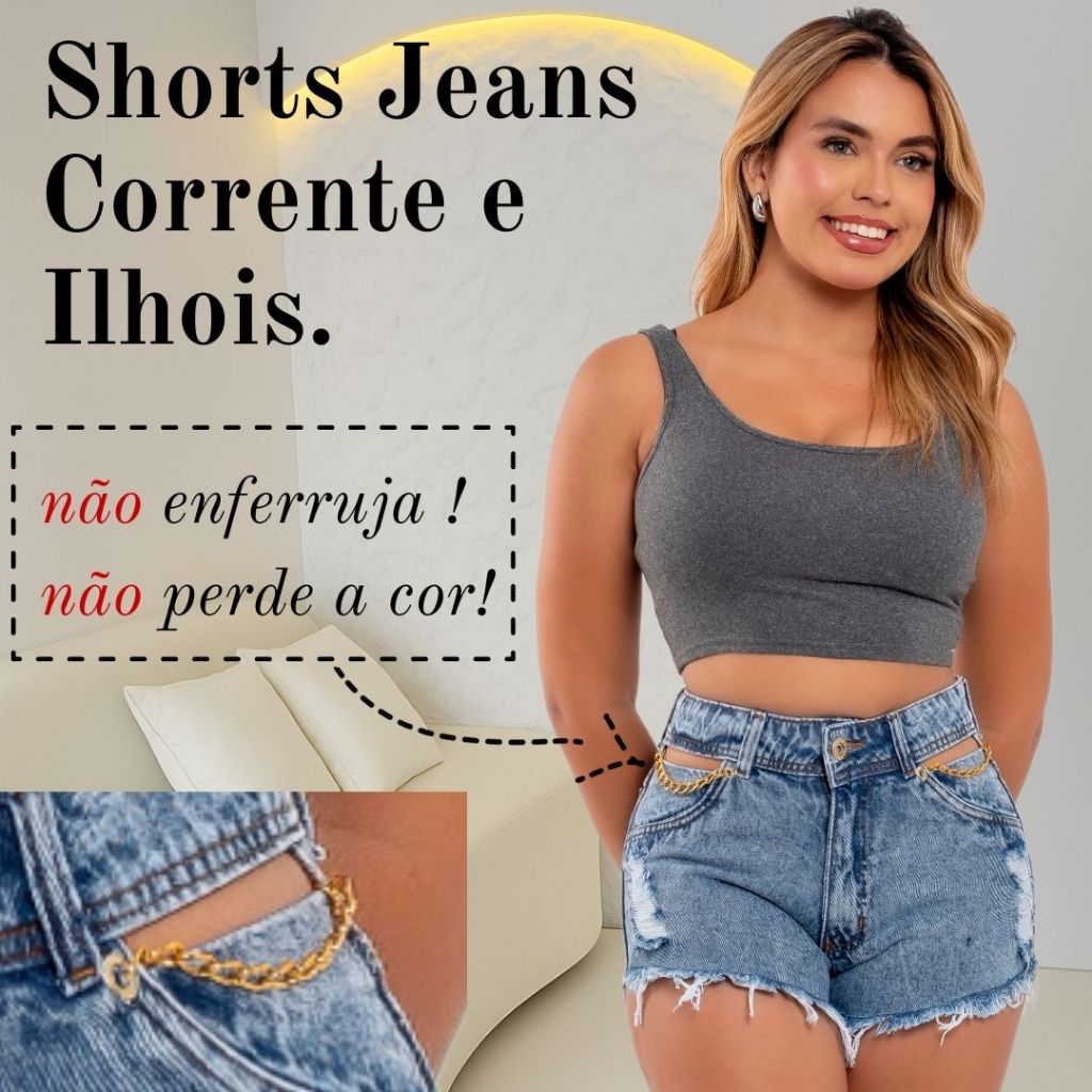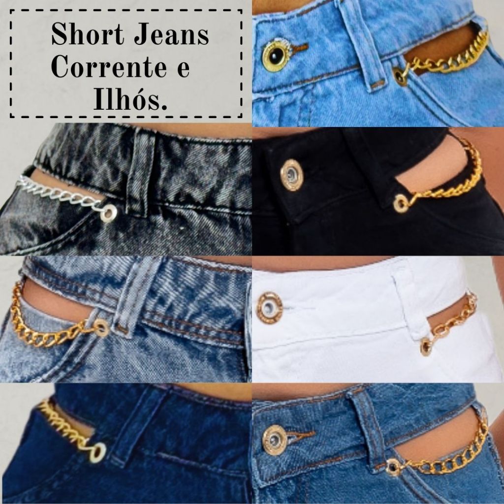 Short Jeans Feminino Com Correntes e Ilhós, Cós Alto
