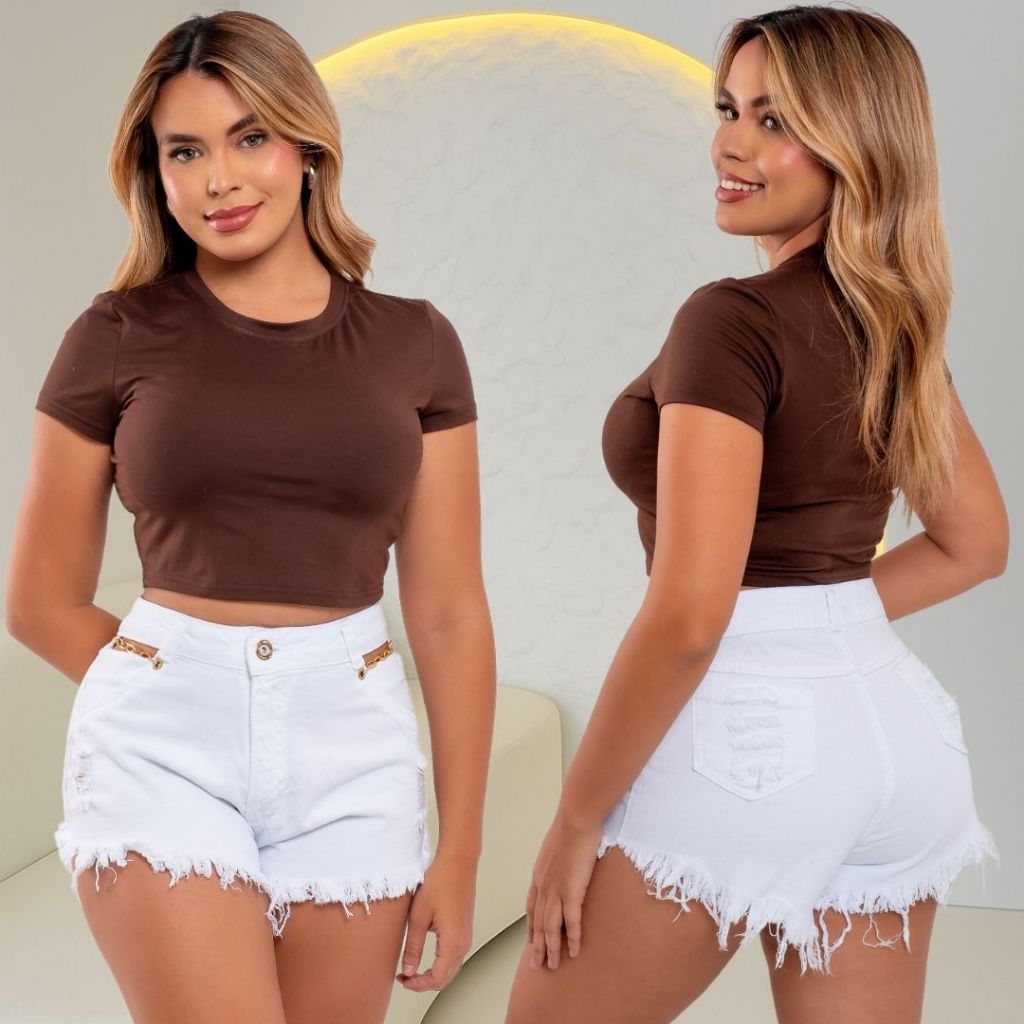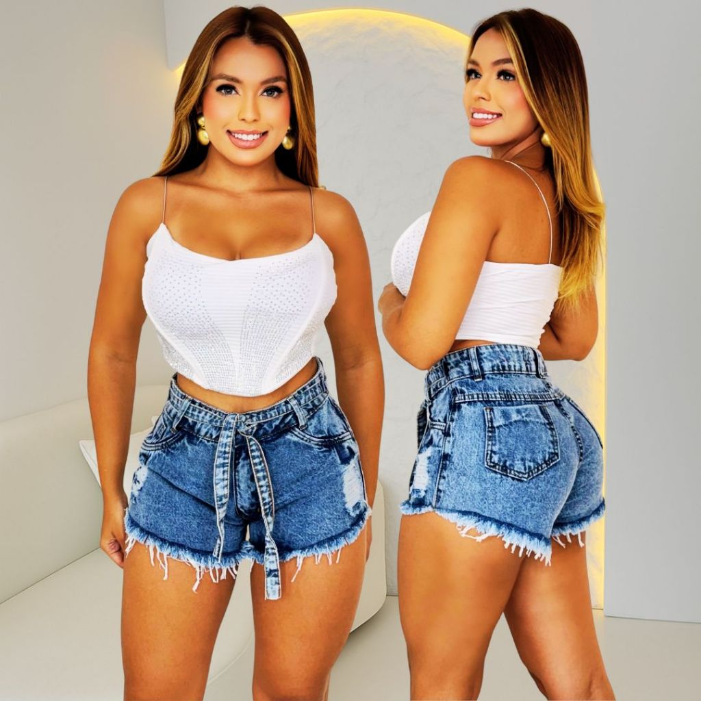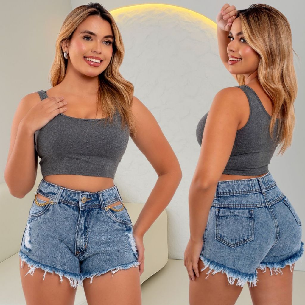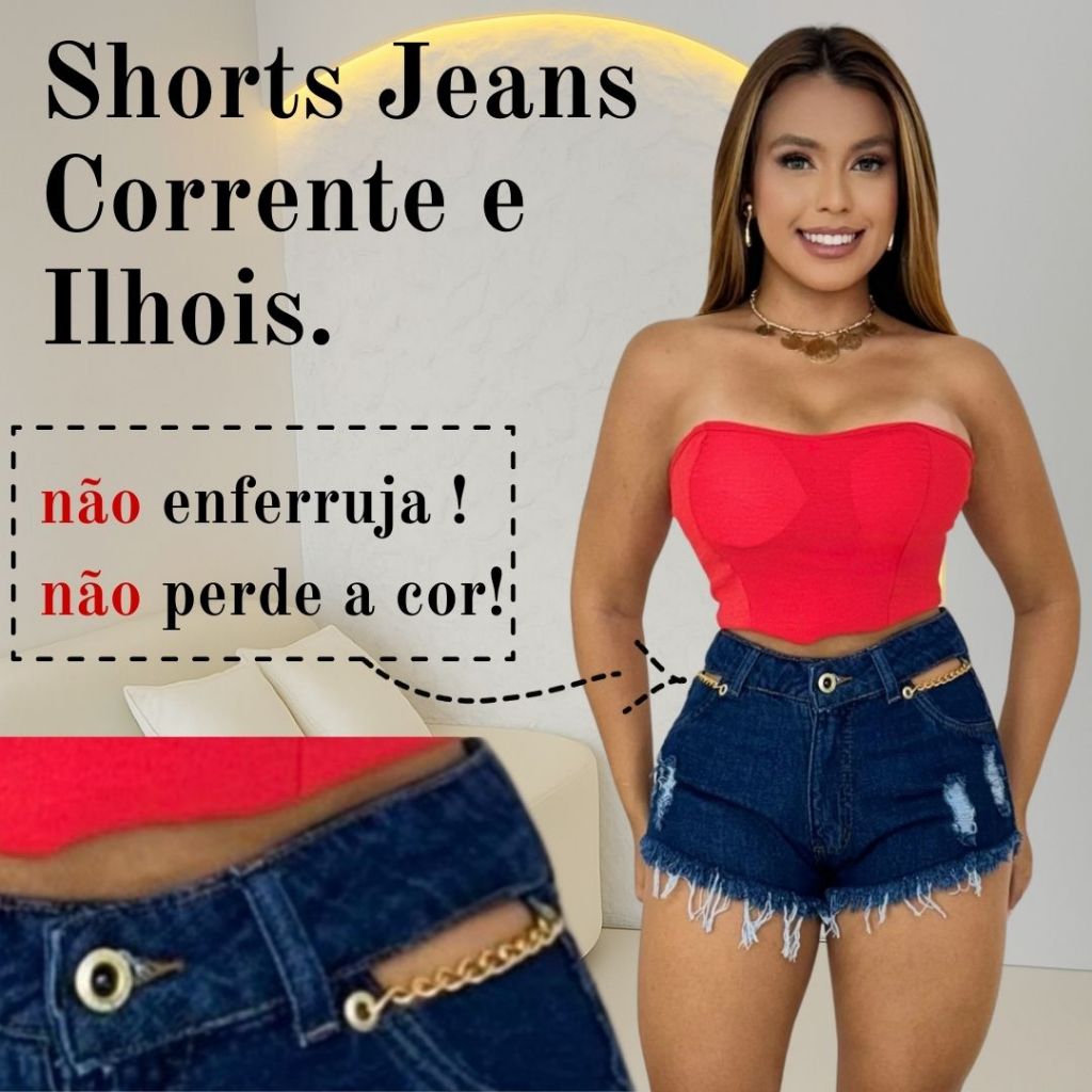 Short Jeans Feminino Com Correntes e Ilhós, Cós Alto