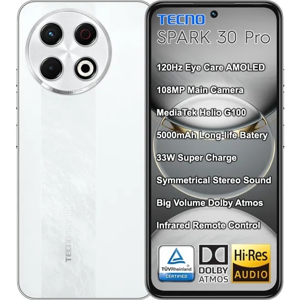 Tecno Spark 30 PRO 4G 256GB+8GB RAM, Câmera 108MP, Mediatek Hélio G100, 5000mAh, Versão Global