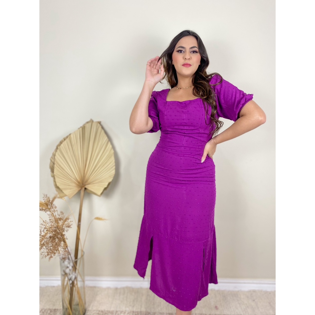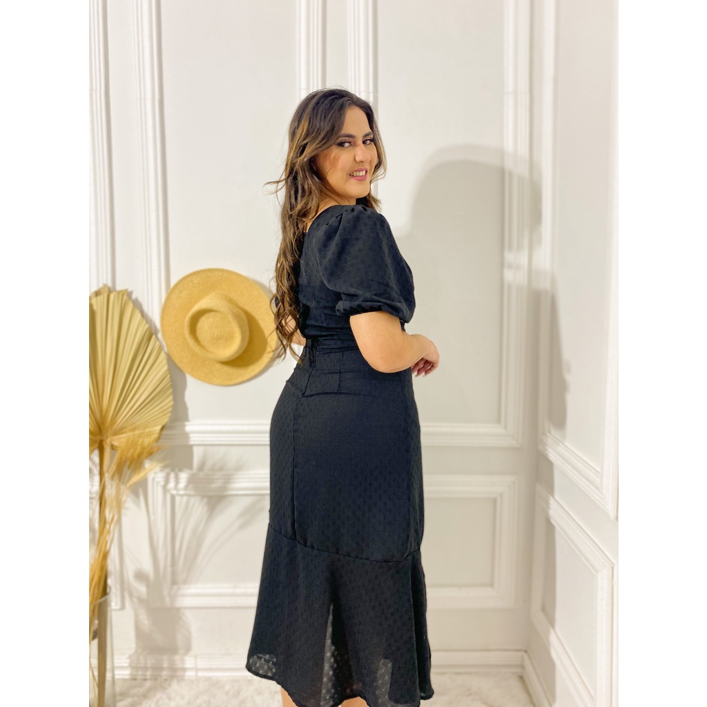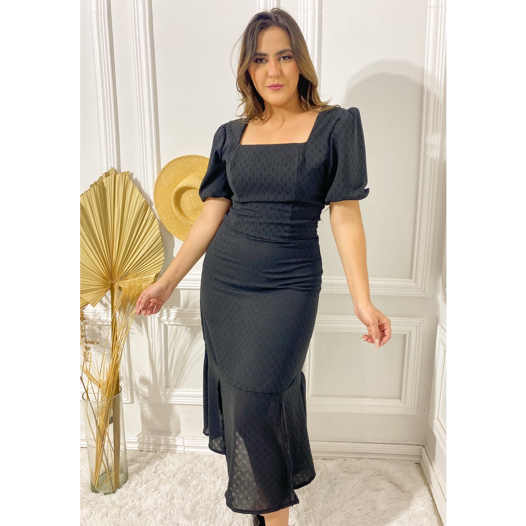 Vestido manga curta mídi decote princesa moda evangélica look para ir para igreja e dia dia