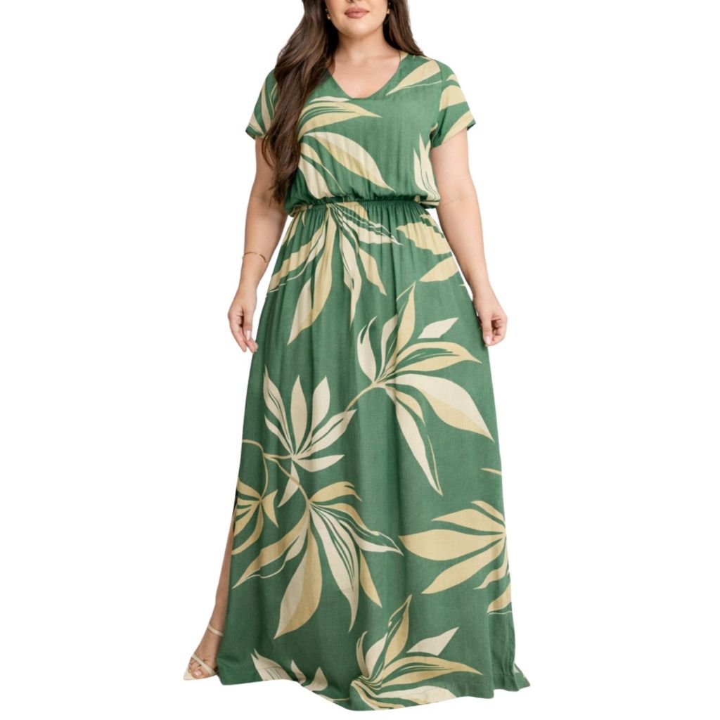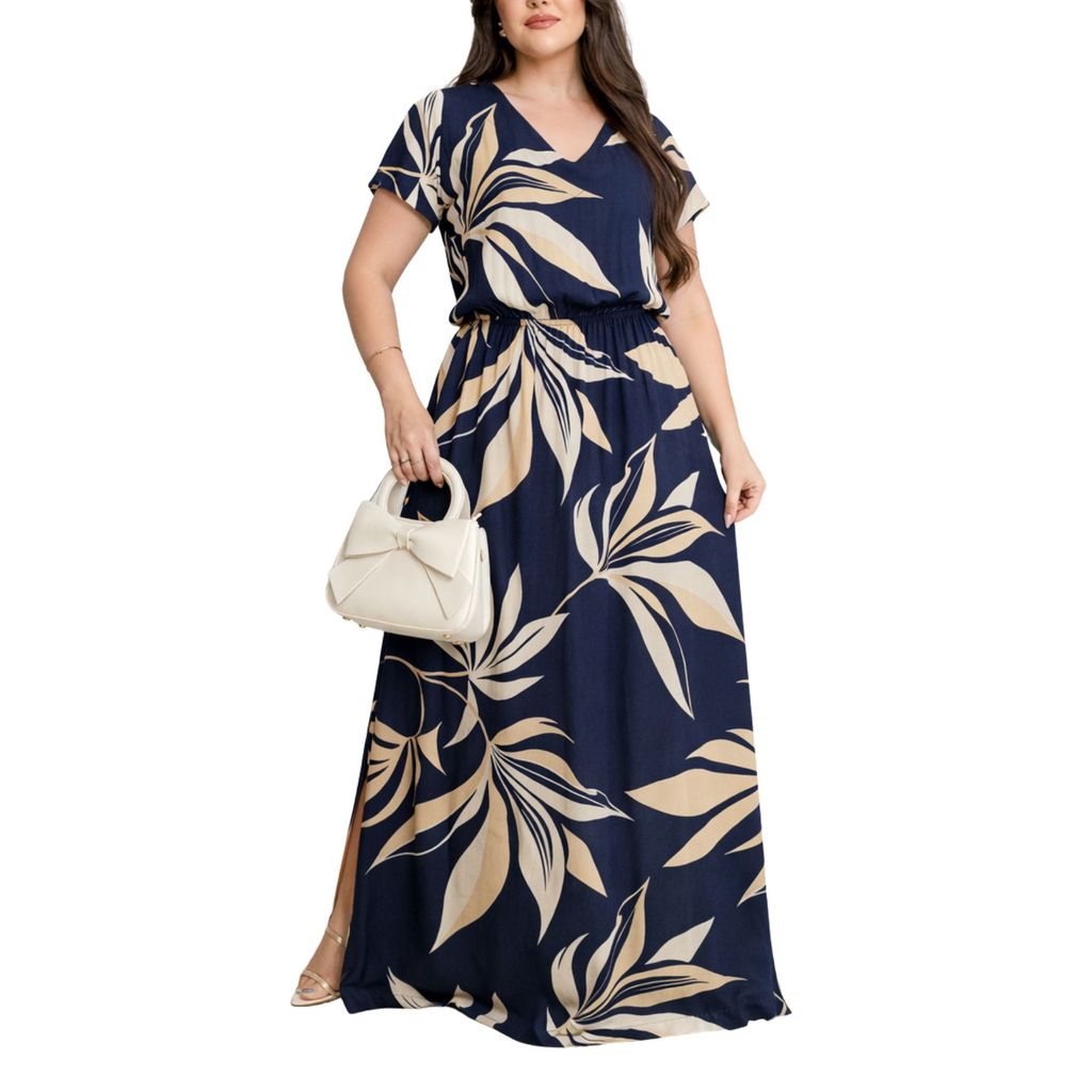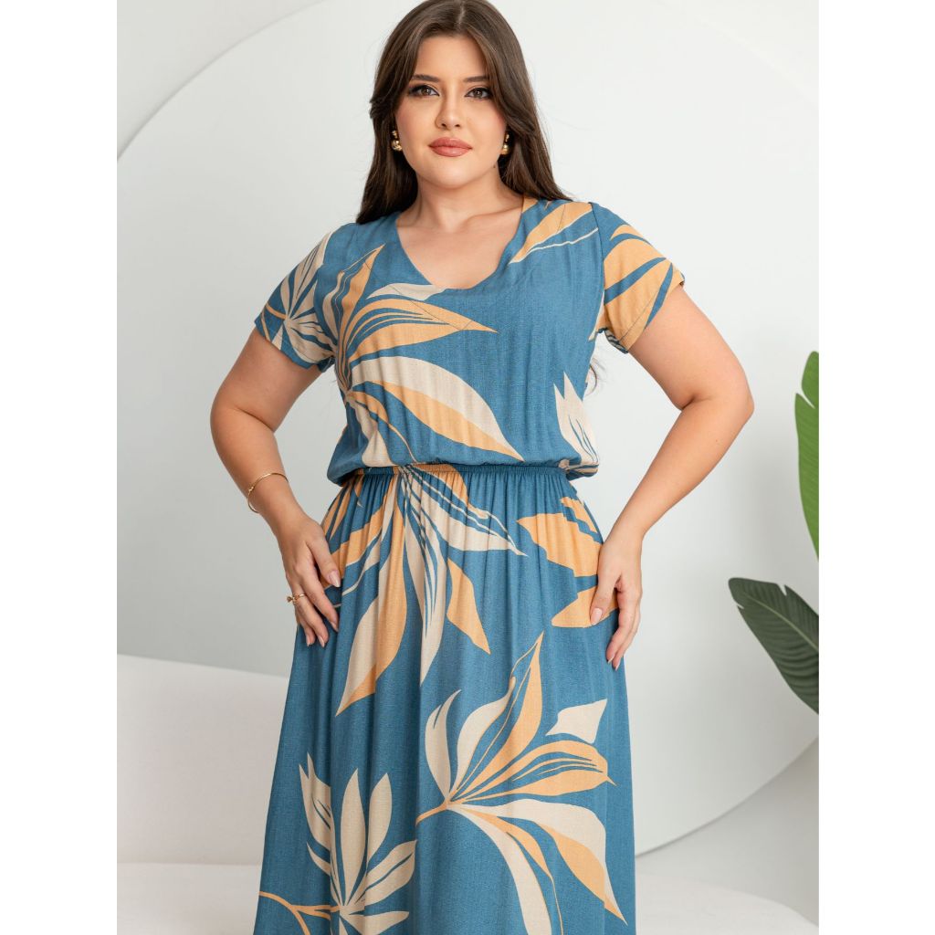 Vestido Longo Feminino Estampado Tropical Manga Curta Decote V Cintura com Elástico Casual Elegante