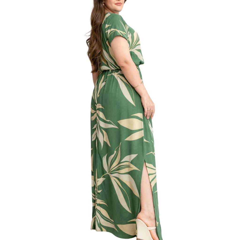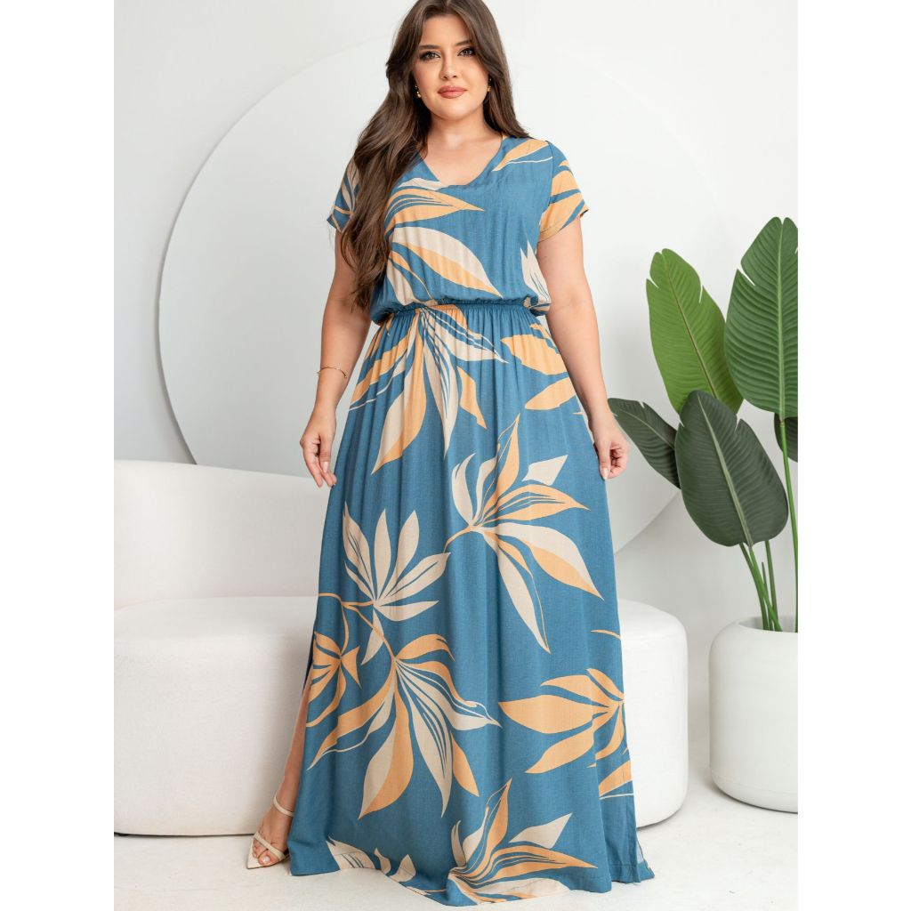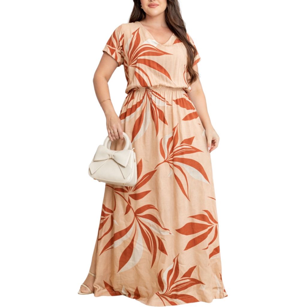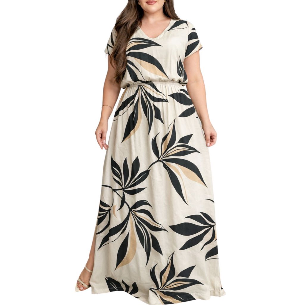 Vestido Longo Feminino Estampado Tropical Manga Curta Decote V Cintura com Elástico Casual Elegante