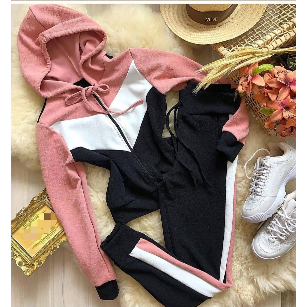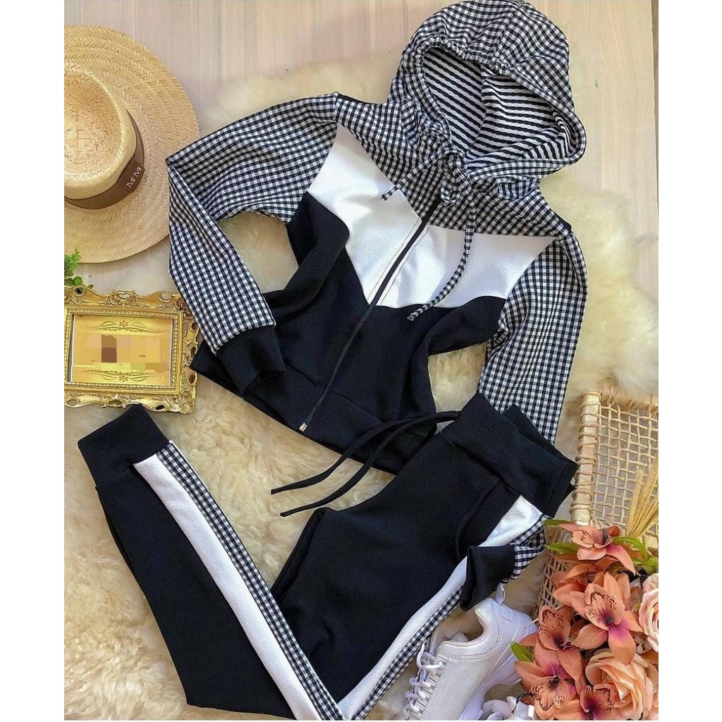 Conjunto manga longa com calça detalhes xadrez com capuz e ziper