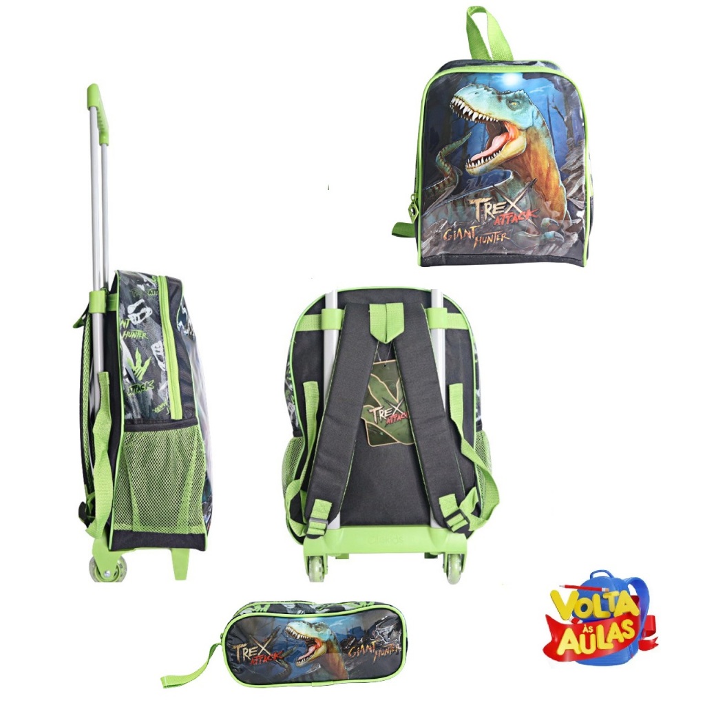 Kit Mochila Rodinhas + Lancheira + Estojo Dinossauros T-Rex Volta as Aulas Resistente Promoção
