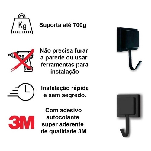 Gancho Cabide Porta Toalha de Rosto Parede Banheiro 3M Preto