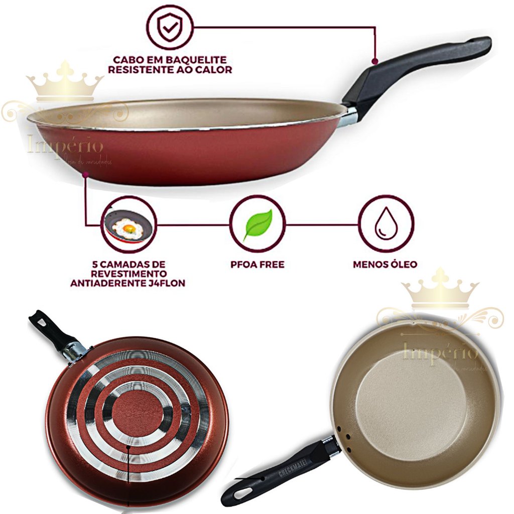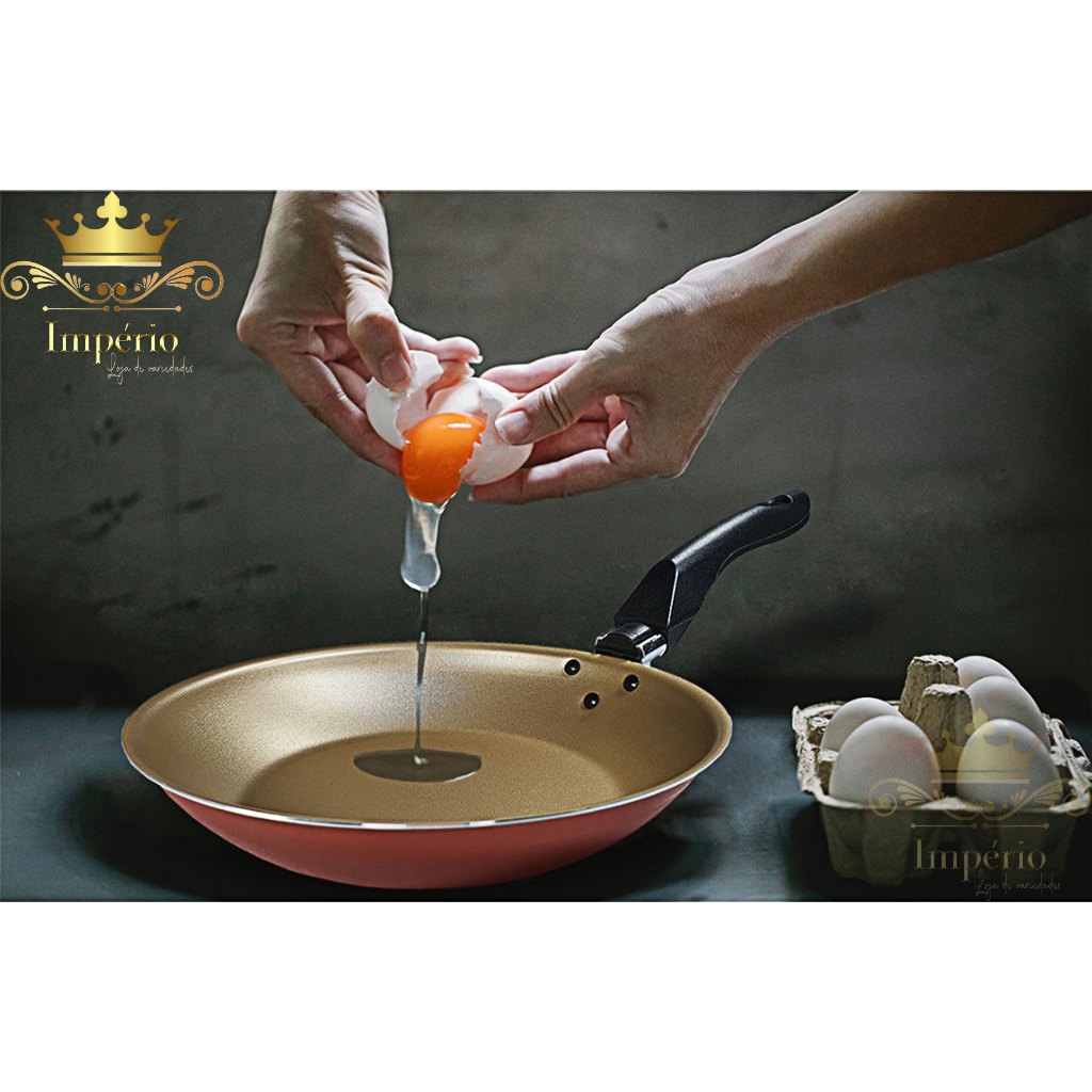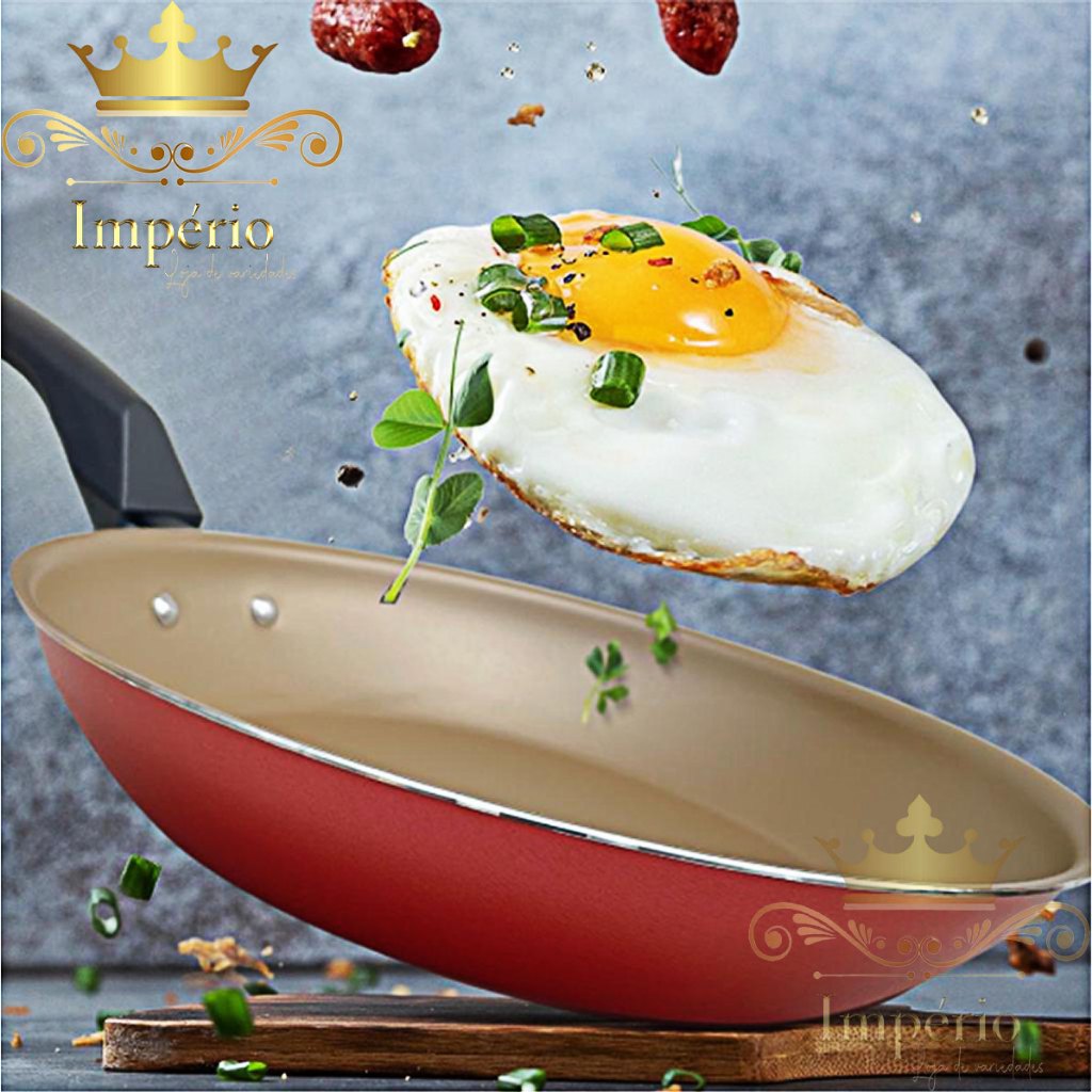Kit de Frigideiras 3 Peças Tamanho 20, 18 E 16 Cm Com Espátula 3 Frigideira Antiaderente Francesa Com 5 Camadas De Teflon Cor Cereja Dourada Cobre Alumínio Reforçada Funda Para Ovo